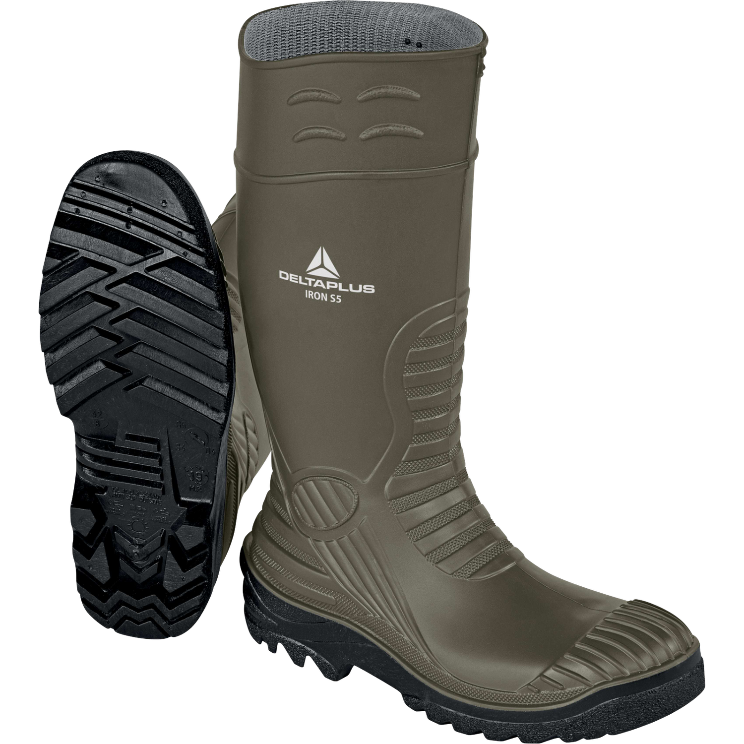 The DeltaPlus IRON S5 SRC Safety Boots are expertly crafted for extreme environments, providing maximum protection, stability, and durability. Made with a reinforced PVC upper, stainless steel toe cap, and anti-perforation insert, these boots shield against impact, punctures, and harsh conditions. The shock-absorbing heel and slip-resistant nitrile-PVC outsole offer superior comfort and traction, while the textured upper allows for easy wear and quick removal. Stay safe and secure in any situation with these heavy-duty boots.