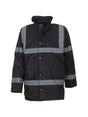 Fully waterproof & windproof security jacket with the enhanced visibility for safety. PU coated Nylon outer fabric with 190g quilted padding and Nylon lining. Heavy duty zip with studded storm flap. 2 outer pockets with over flaps. Elasticated Knitted storm cuffs in the sleeve ends. Step collar with a concealed integral hood. Inside breast pocket. Throughout stitched and taped seams to ensure waterproof. Matching trousers available, code HVS461.