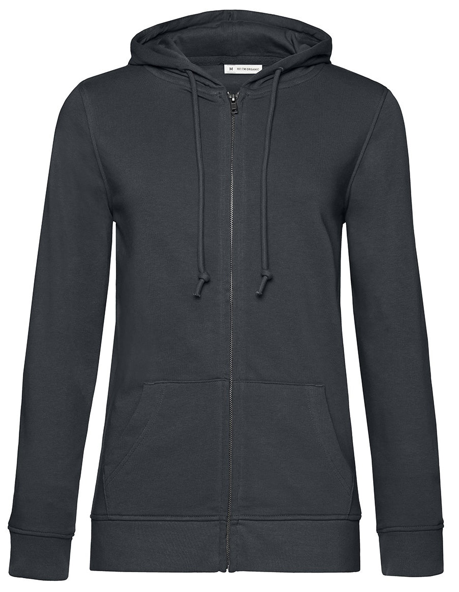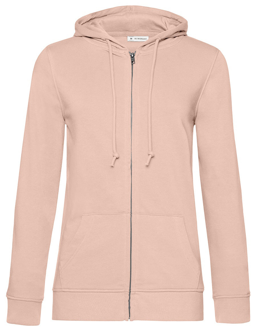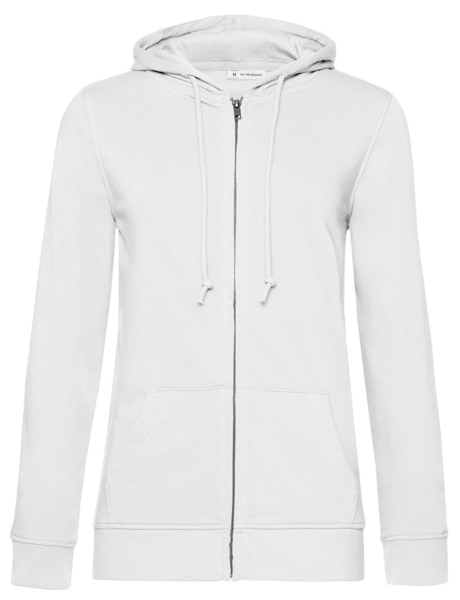 Trendy organic zipped hooded sweatshirt with retail fashion oriented look and feel. Strong styling with great fitting and perfect length. Side seams ensure the best fit and a feminine silhouette. Visible "Hi, I'm Organic" neck tab to highlight the organic value of the garment. Easy branding solution - B&C No Label Solution. Inside single Jersey halfmoon in back to allow easy branding personalisation. Qualitative herringbone neck tape. Retail like features: covered metal zip, single Jersey lined hood, qualitative herringbone neck tape and fashionable drawcord.