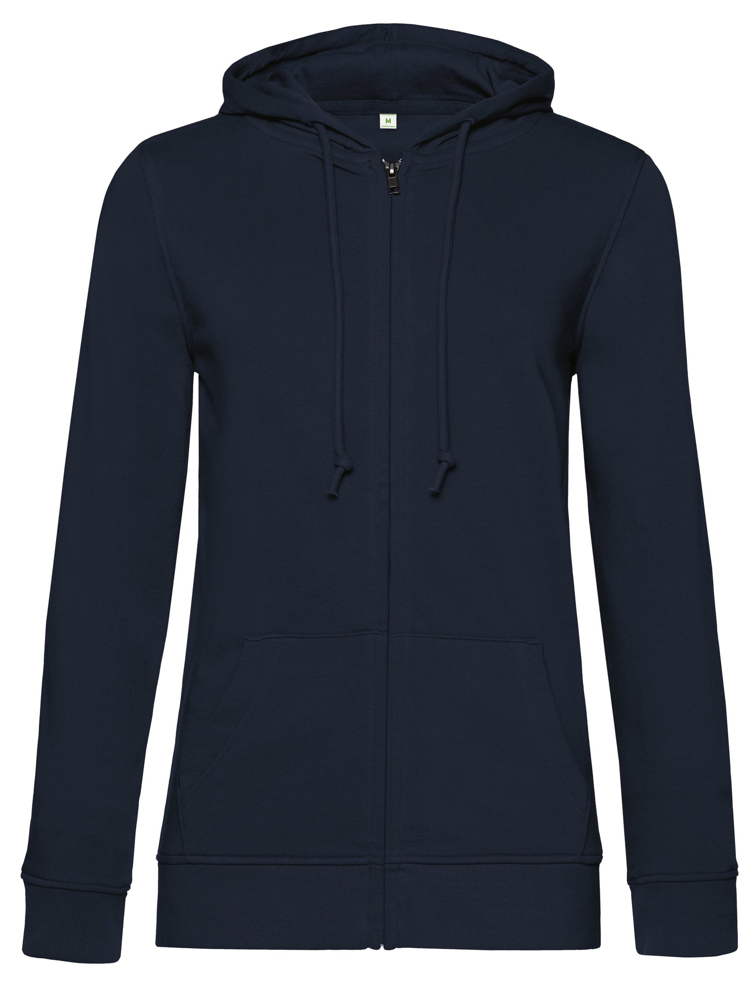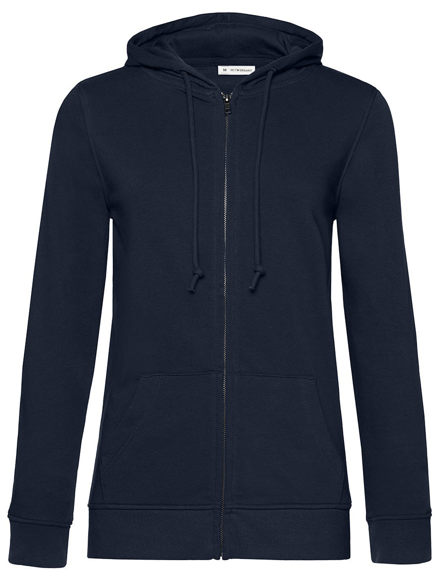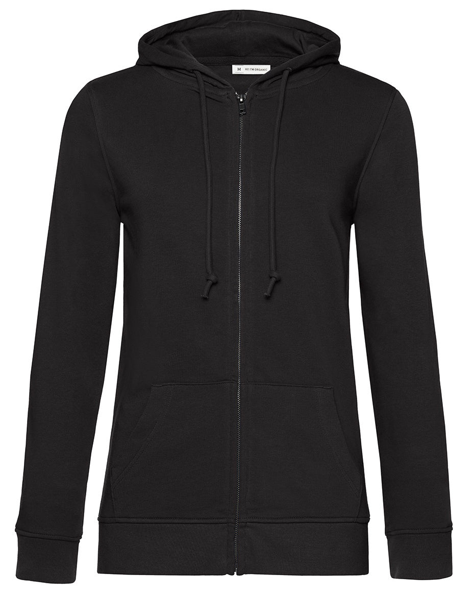 Trendy organic zipped hooded sweatshirt with retail fashion oriented look and feel. Strong styling with great fitting and perfect length. Side seams ensure the best fit and a feminine silhouette. Visible "Hi, I'm Organic" neck tab to highlight the organic value of the garment. Easy branding solution - B&C No Label Solution. Inside single Jersey halfmoon in back to allow easy branding personalisation. Qualitative herringbone neck tape. Retail like features: covered metal zip, single Jersey lined hood, qualitative herringbone neck tape and fashionable drawcord.