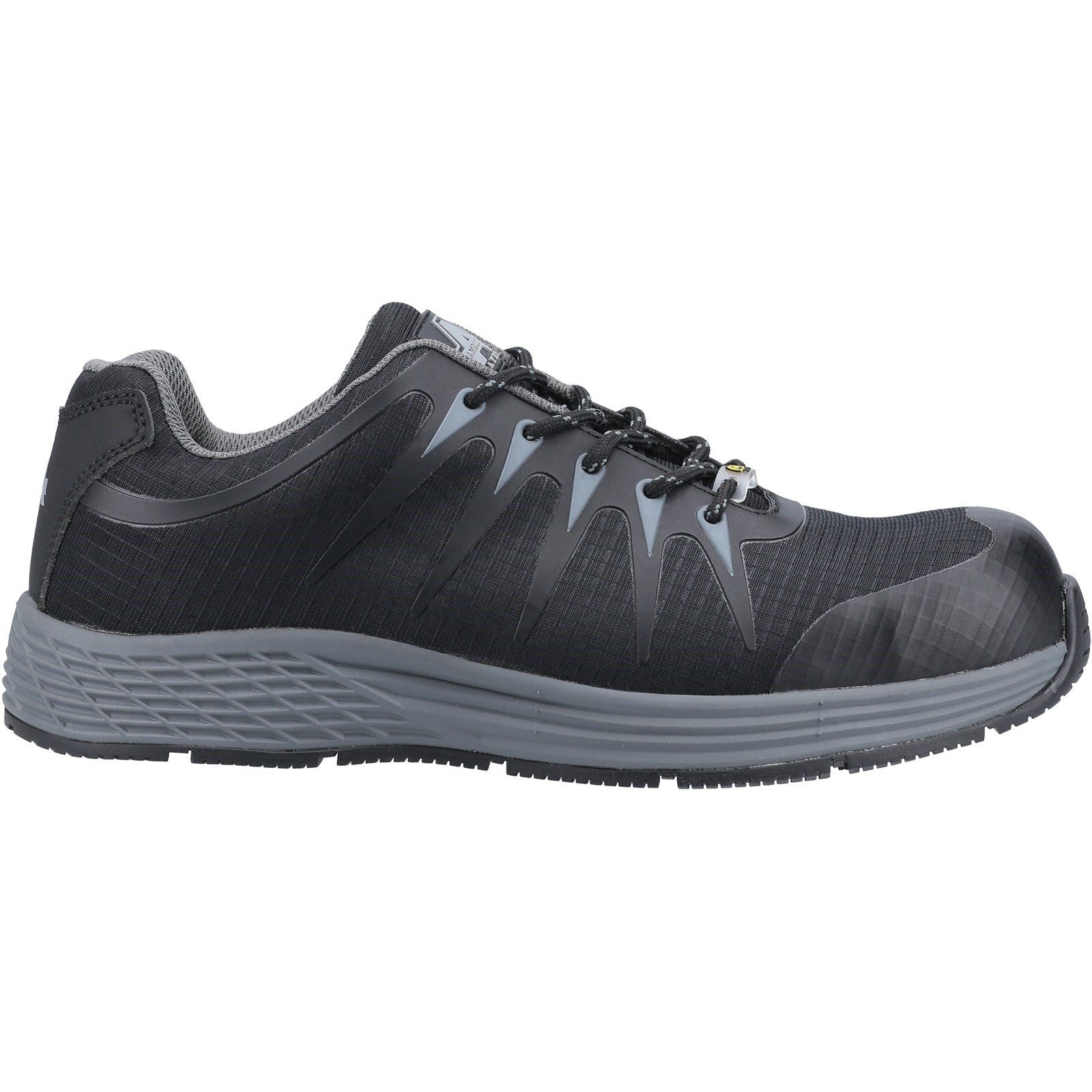 Electrostatic dissipative (ESD) metal-free lightweight Softshell safety trainer with 200J composite safety toe and underfoot midsole protection. Hardwearing rubber outsole with sporty, cushioning EVA midsole. This is a Vegan-friendly safety trainer.
