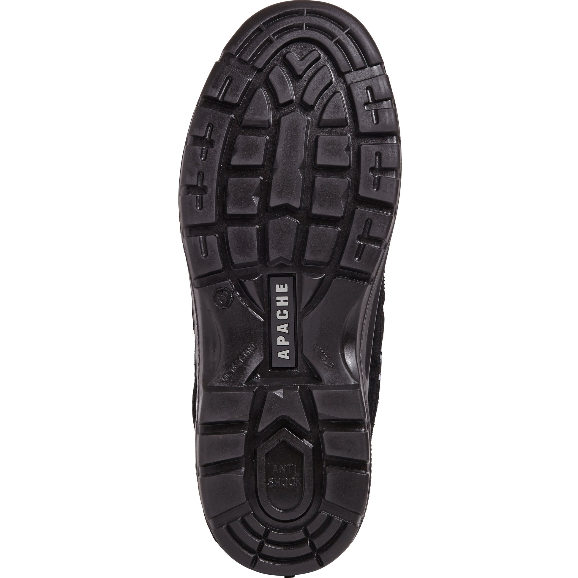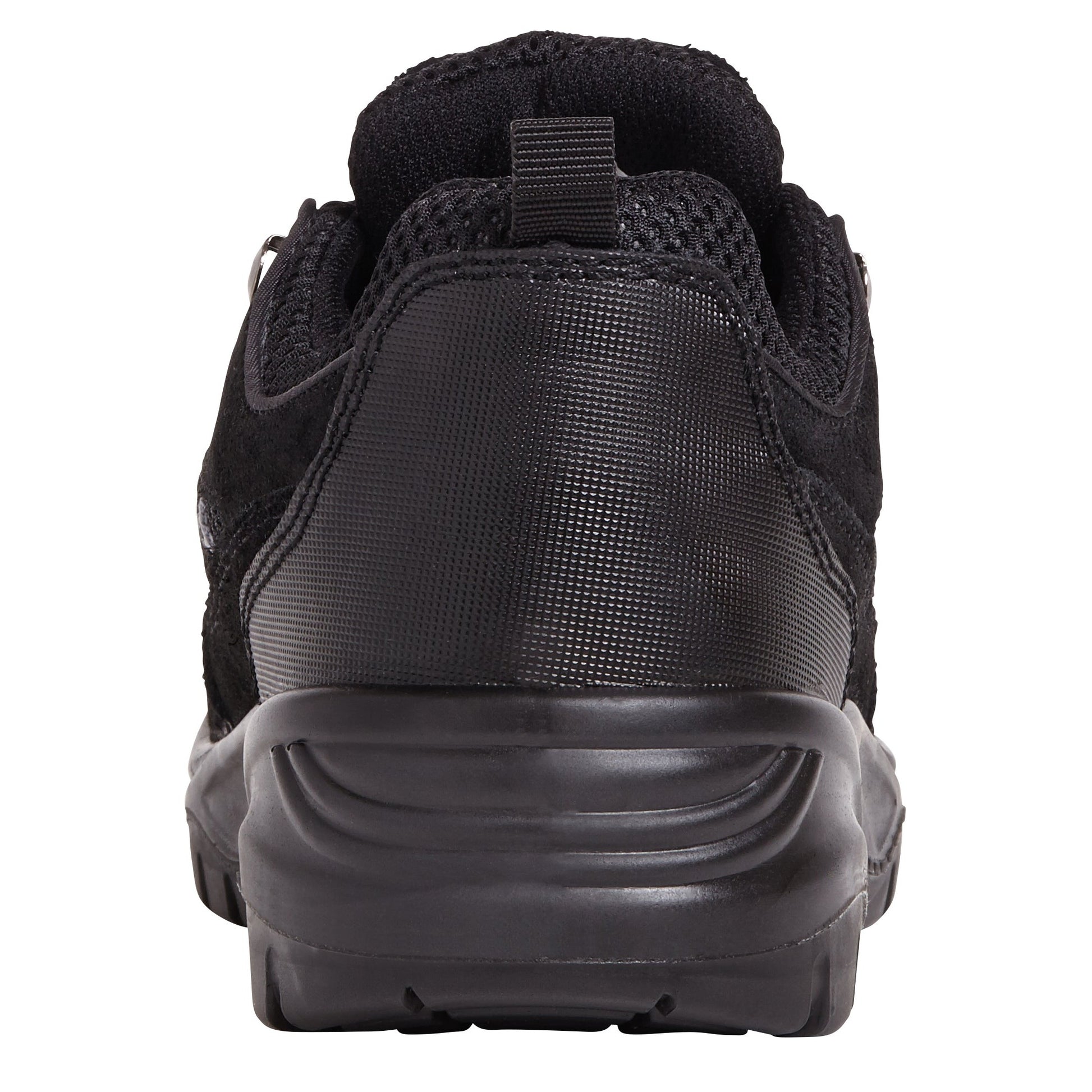 Black suede safety trainer. Padded collar and tongue for added comfort. Steel toe cap and steel midsole protection. Anti-scuff toe guard. Dual density polyurethane outsole. Anti-Static. A good all round shoe for most trades.