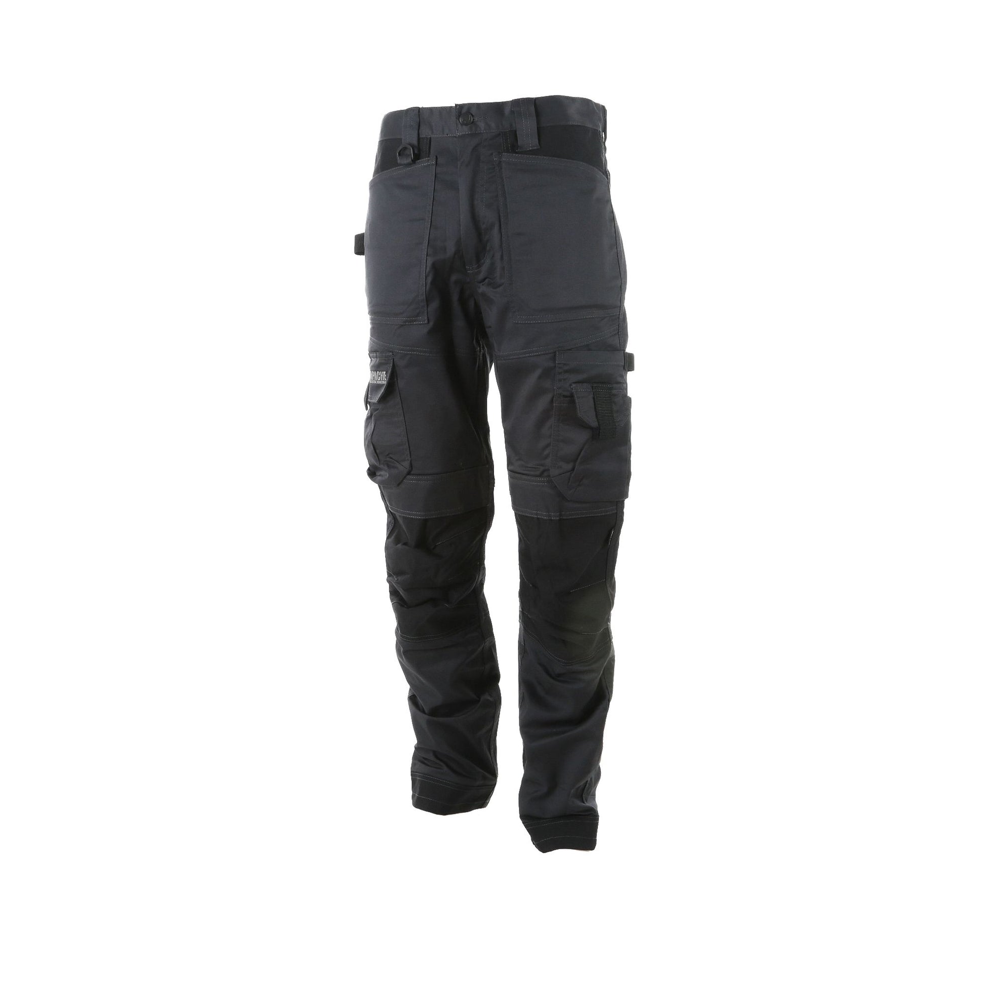 A lightweight work trouser featuring Cordura holster pockets and knee pad pockets. This trouser has a modern tapered leg and the fabric has 4- way comfort stretch. Cordura reinforced hem. Side cargo pocket and padded phone pocket to opposite leg. Triple stitched in key areas. Low rise comfort waist. Tunnel belt loop and YKK zip. A good all -round tradesman trouser.