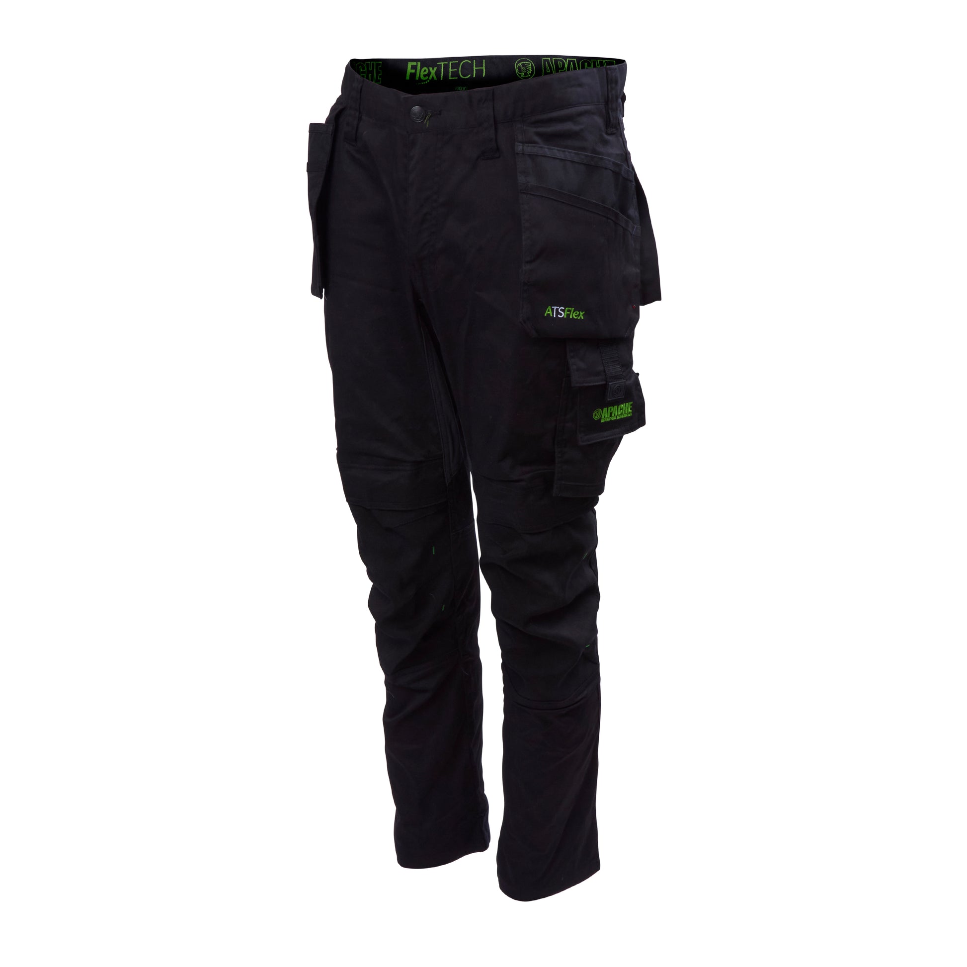 A 3D shaped work trouser with 360 degree flex and stretch. The stretch panels can be found in the knee pad pockets, the guesset, the rear and also in our new FlexTech waistband giving you additional areas of movement. Fashion fit slimmer leg fit. Shaped holster pockets. Twin velcro tool holder. Cordura reinforced hem and pockets. YKK zipper. A trouser fully engineered for the worker.