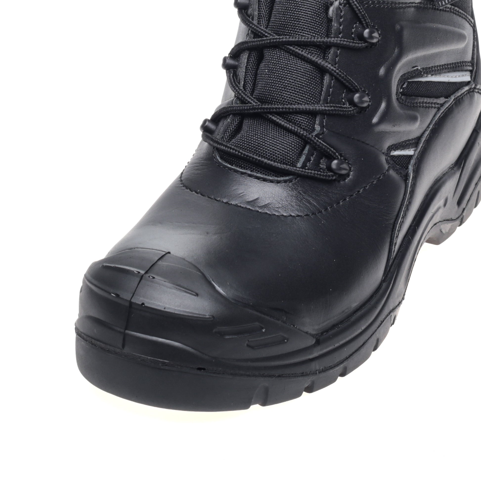 Black Leather Non Metallic Waterproof Boot. Composite Toe Cap and Mid-sole, Rubber outsole HRO tested,TPU Toe and Heel Trim, Cordura inserts on the leg, Zip and Velcro on the Inside of the Leg for quick release.
