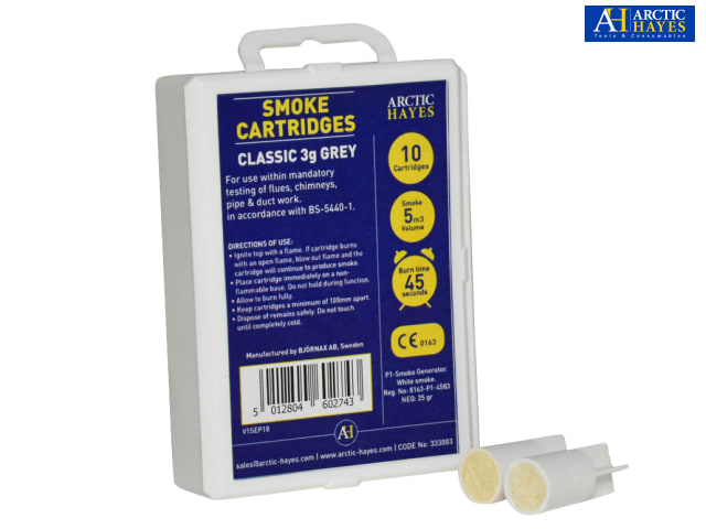 Arctic Hayes Classic 3g Smoke Cartridges with an easy-to-use finger grip base. Perfect for testing air filters, fume hoods, air balancing and fans, as well as for use within mandatory testing of flues, chimneys, pipe and ductwork.