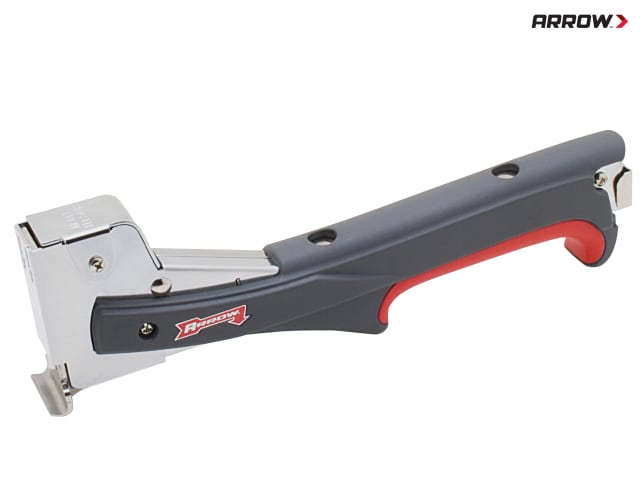 Arrow HTX50 Professional Hammer Tacker with steel construction, jam resistant mechanism and precision locked rear loading. It has an ergonomic soft rubber grip for easy all day use, a recessed hand grip which protects the hand from scraping, surface guard flange which reduces damage to surface and a knuckle guard which avoids surface impact on hand.