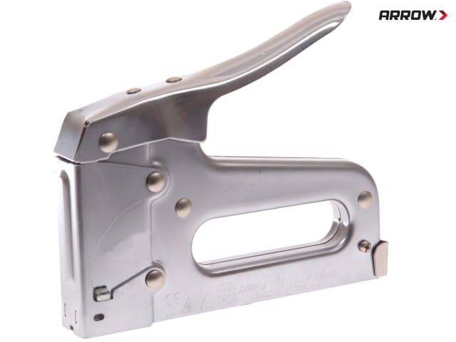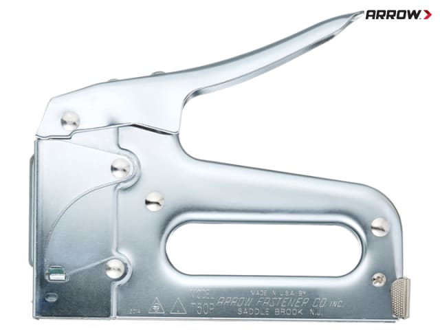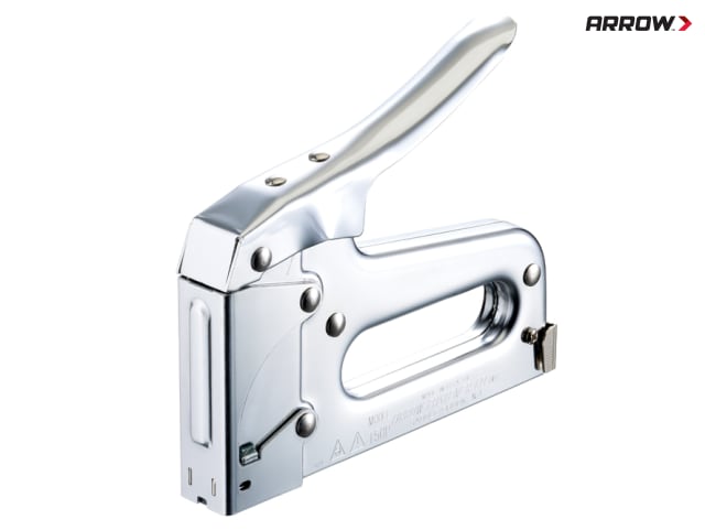 The Arrow T50™ professional heavy-duty tacker gun has an all-steel construction with hardened steel working parts and jam-resistant mechanism and a durable chrome finish.
