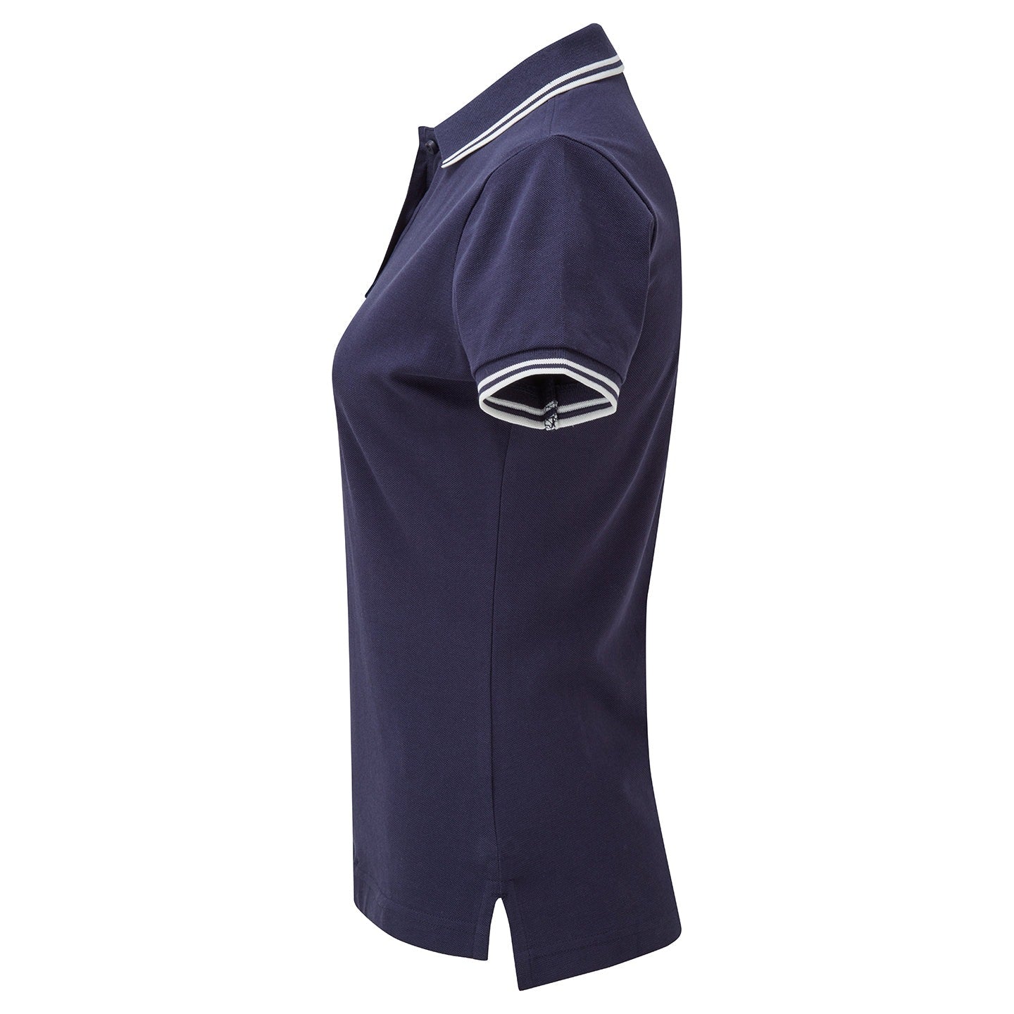Fitted polo for women with tipped contrast detail to the collar and cuffs. Two contrast coloured buttons on placket. Contrast colour on side vents. Twin-needle stitching on hem. Ribbed knit collar and sleeve cuffs. Machine washable. WRAP certified. BSCI certified. SEDEX certified.Product contains no branded neck label.* Removable Kimble or looped garment tags. Inner seam label holds important product information on one label with a second label containing brand information which can be cut-away.*Please note old stock may contain a fixed branded label