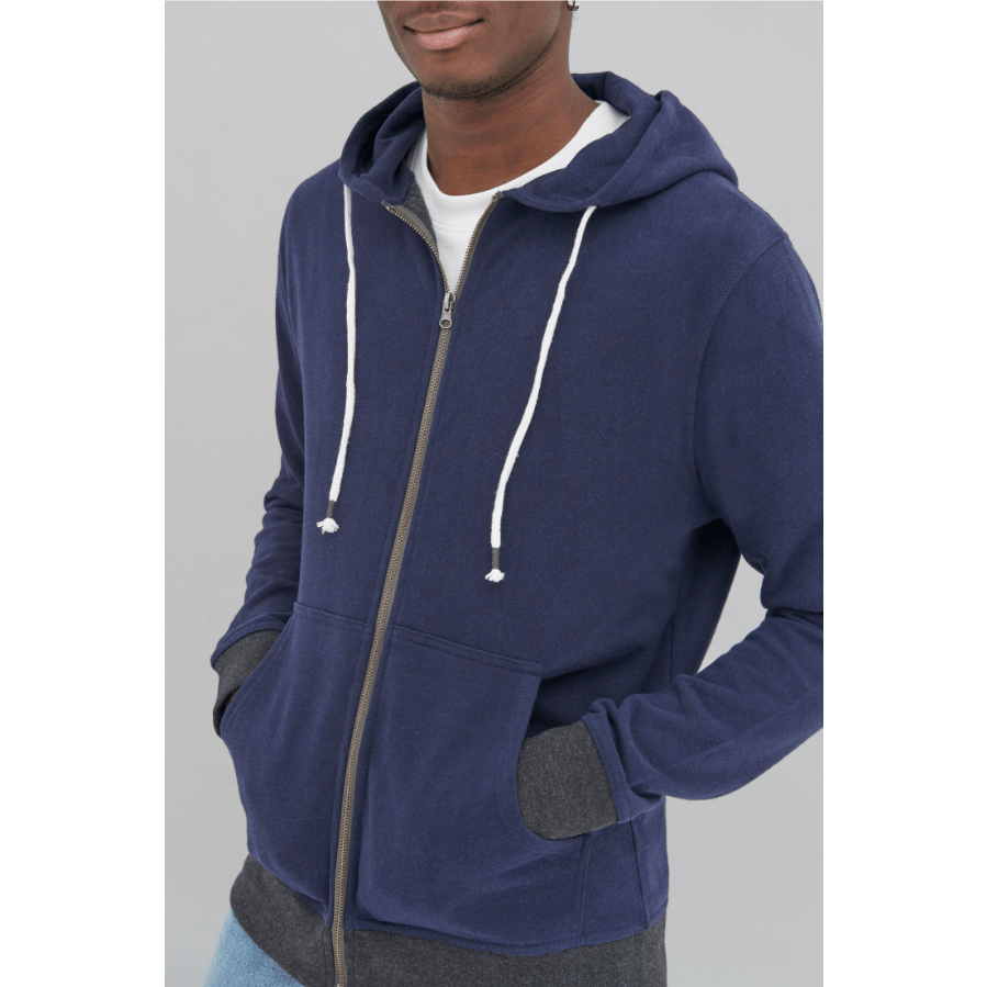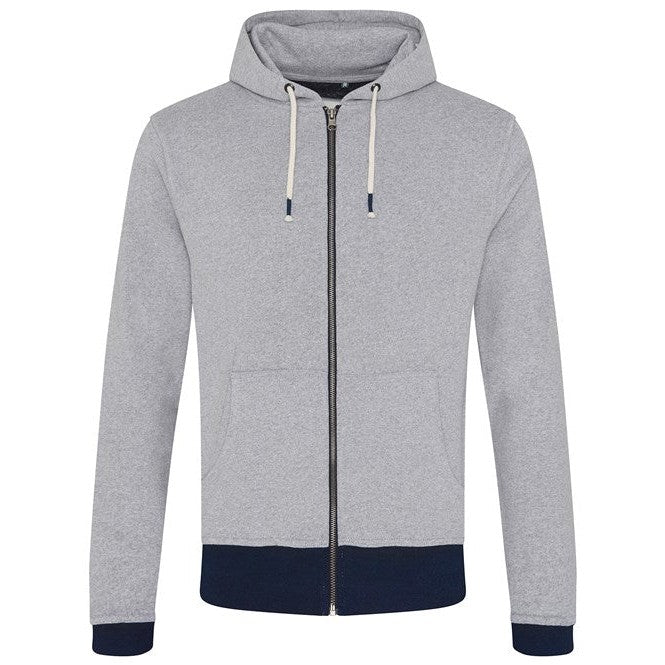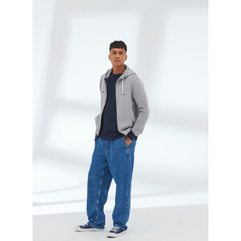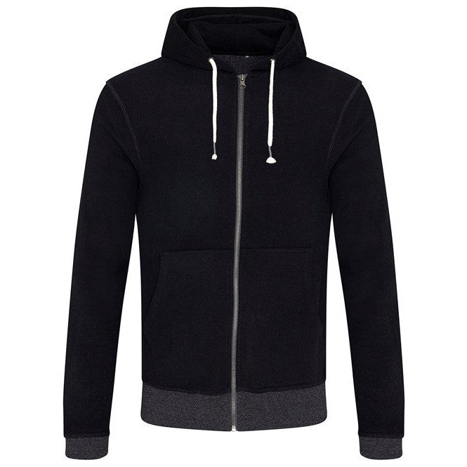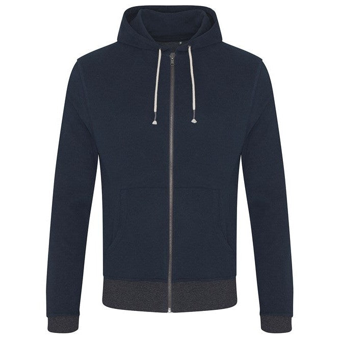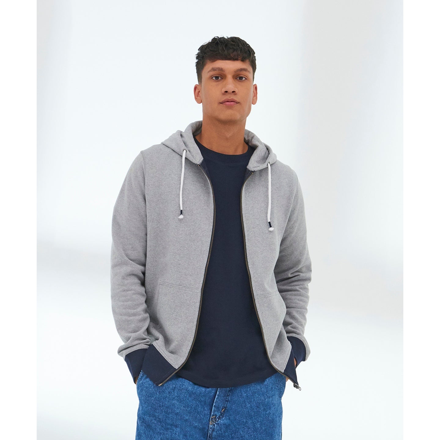 Long sleeve regenerated cotton zoodie with brushed inner and peached outer face. Features include set-in sleeves, contrast rib at cuffs hem, full length front zip and kangaroo pocket. Vegan certified. BSCI certified. Oeko-Tex certified. SEDEX certified.
