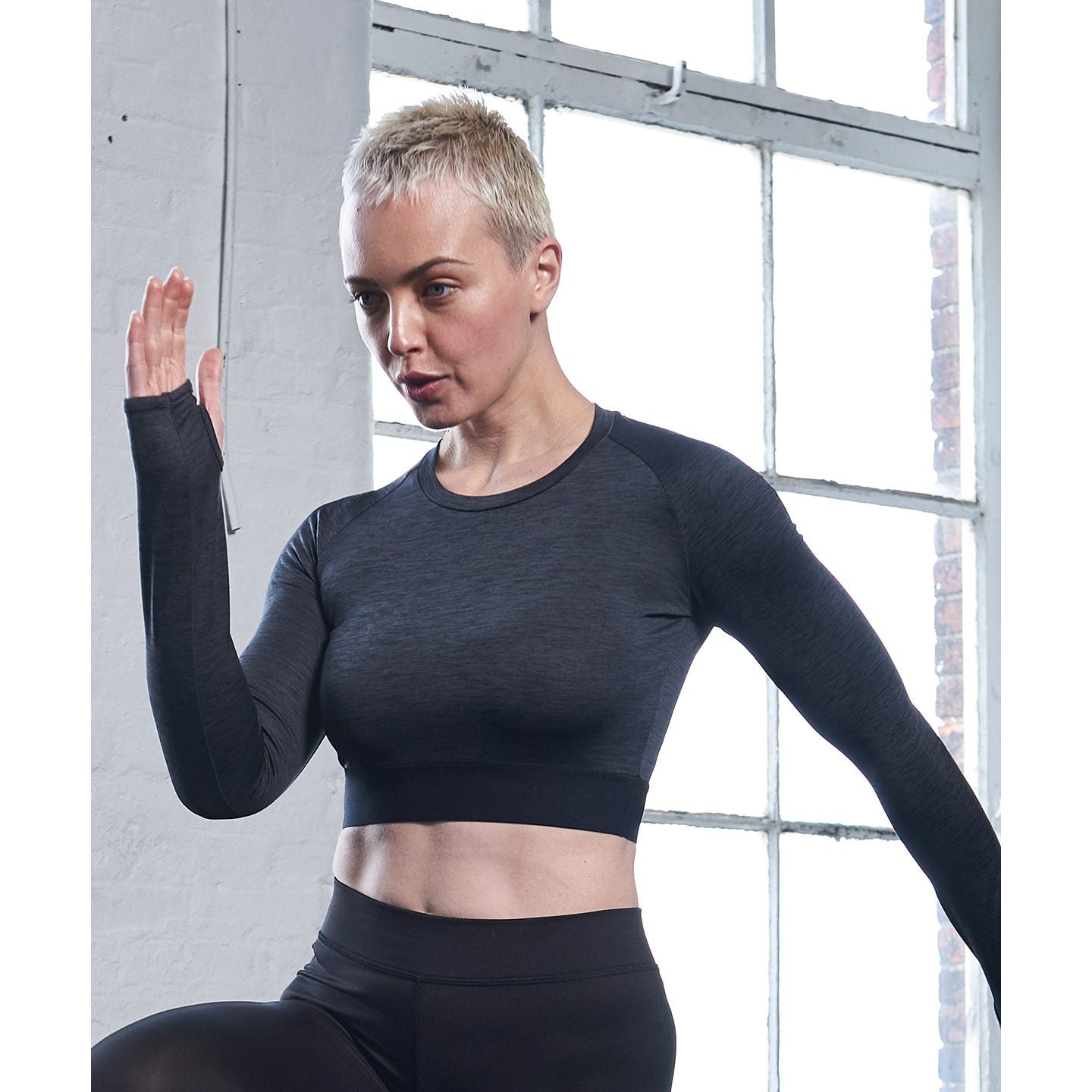 Be bang on-tend with this long sleeve crop that offers you freedom of movement so you can push yourself to your limits. The girlie long sleeve crop T is fun and fashionable, yet the performance fabric keeps you cool and dry during your workout. Raglan sleeves, printable elastic at hem and thumb-loops.