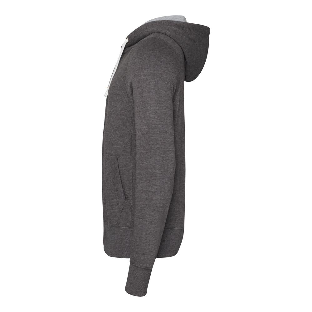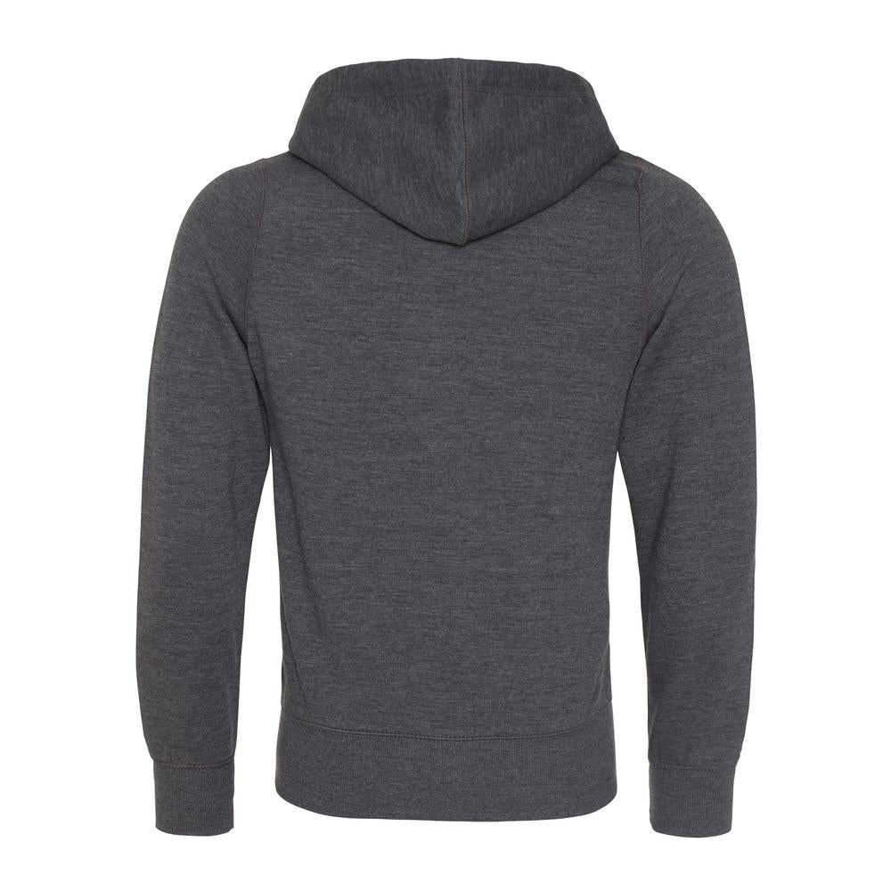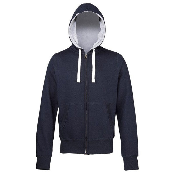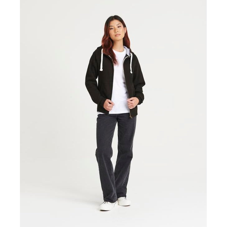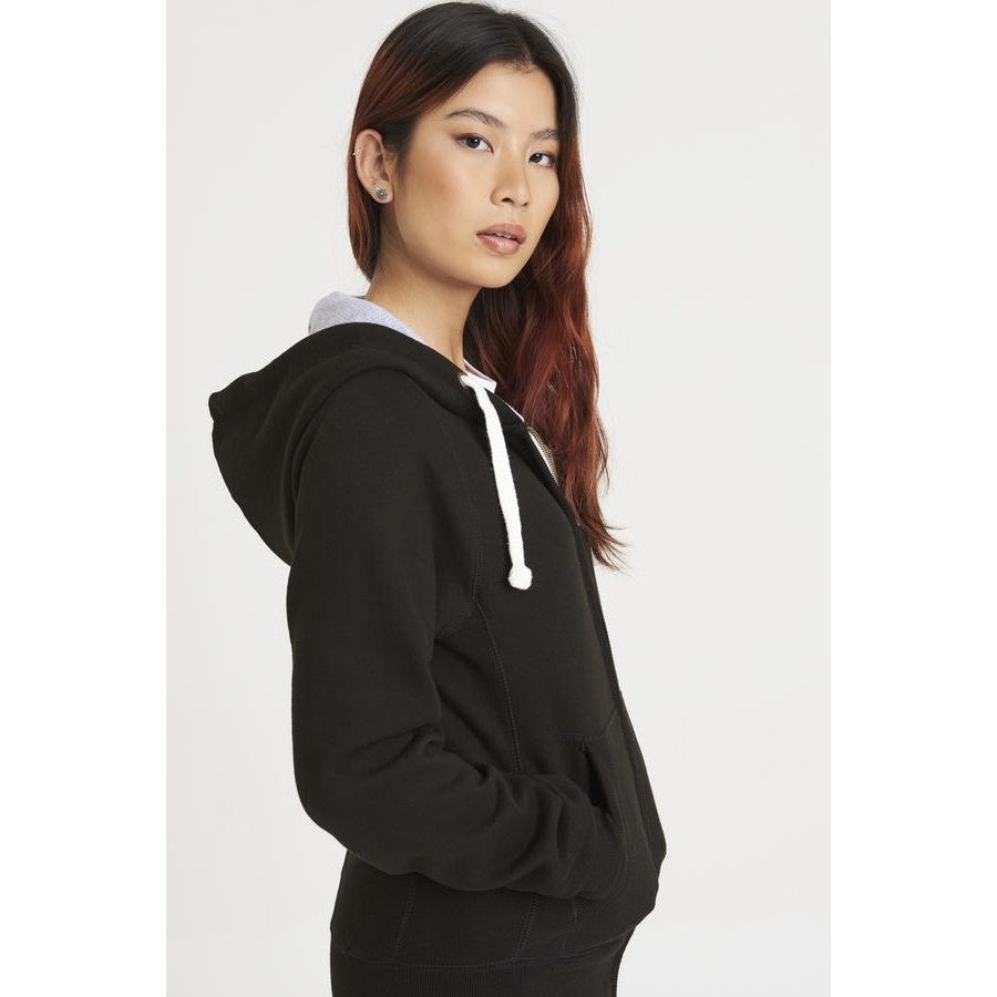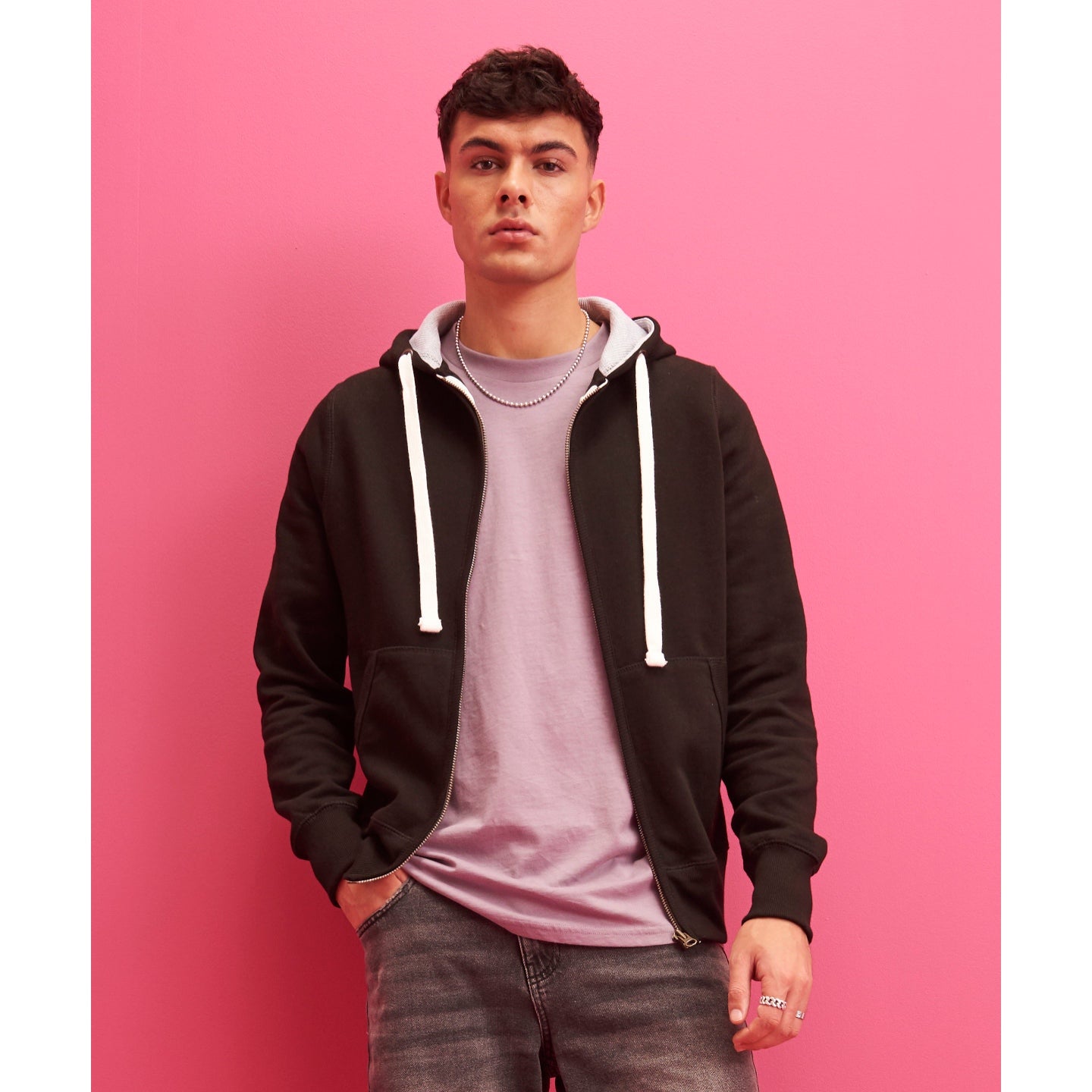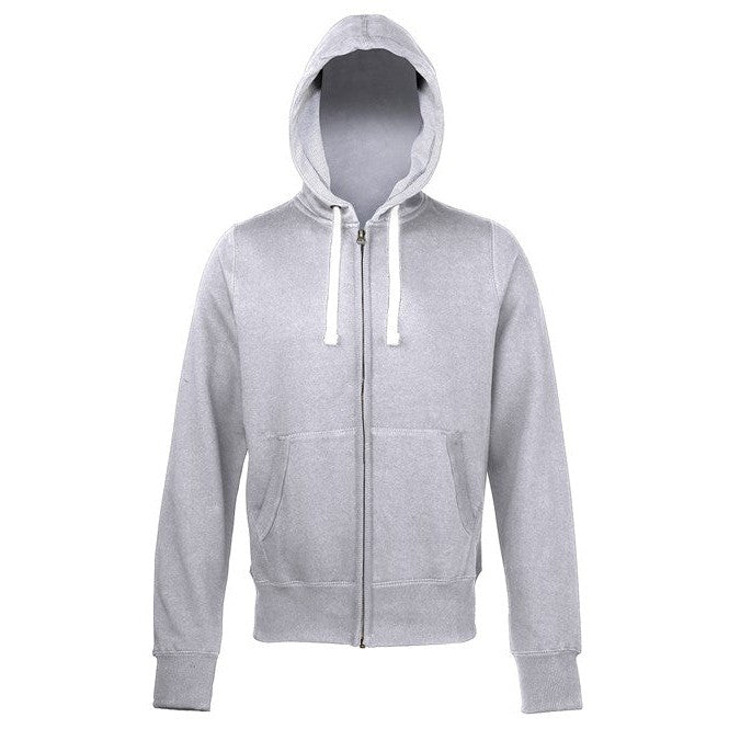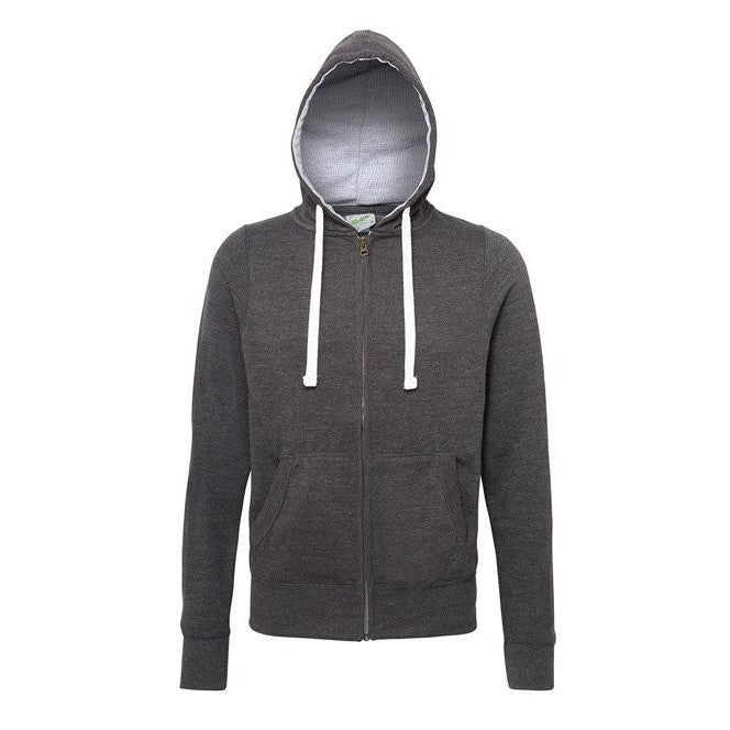 Full zip hoodie. Side panels for stylish fit. Brass zip covered with chunky rib detail. Overlock stitching detail throughout. Double fabric hood with heather grey waffle fabric inner. Chunky white flat lace drawcord. Kangaroo pouch pocket. Deep ribbed cuff and hem. Worldwide Responsible Accredited Production (WRAP) certified production. Soft cotton faced fabric creates ideal printing surface. WRAP certified. SEDEX certified. Vegan certified.