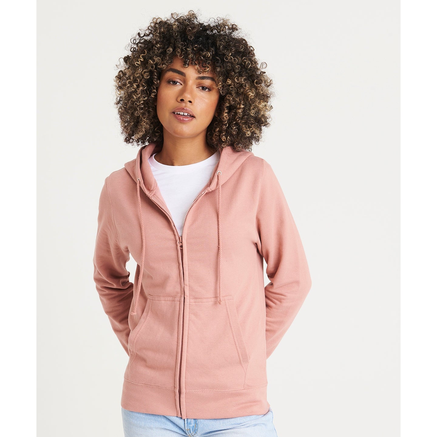 Just Hoods womens college zoodie is just waiting for the perfect print. Its crafted from a super-soft, cotton-faced fabric and made in a feminine fit for comfort satisfaction.