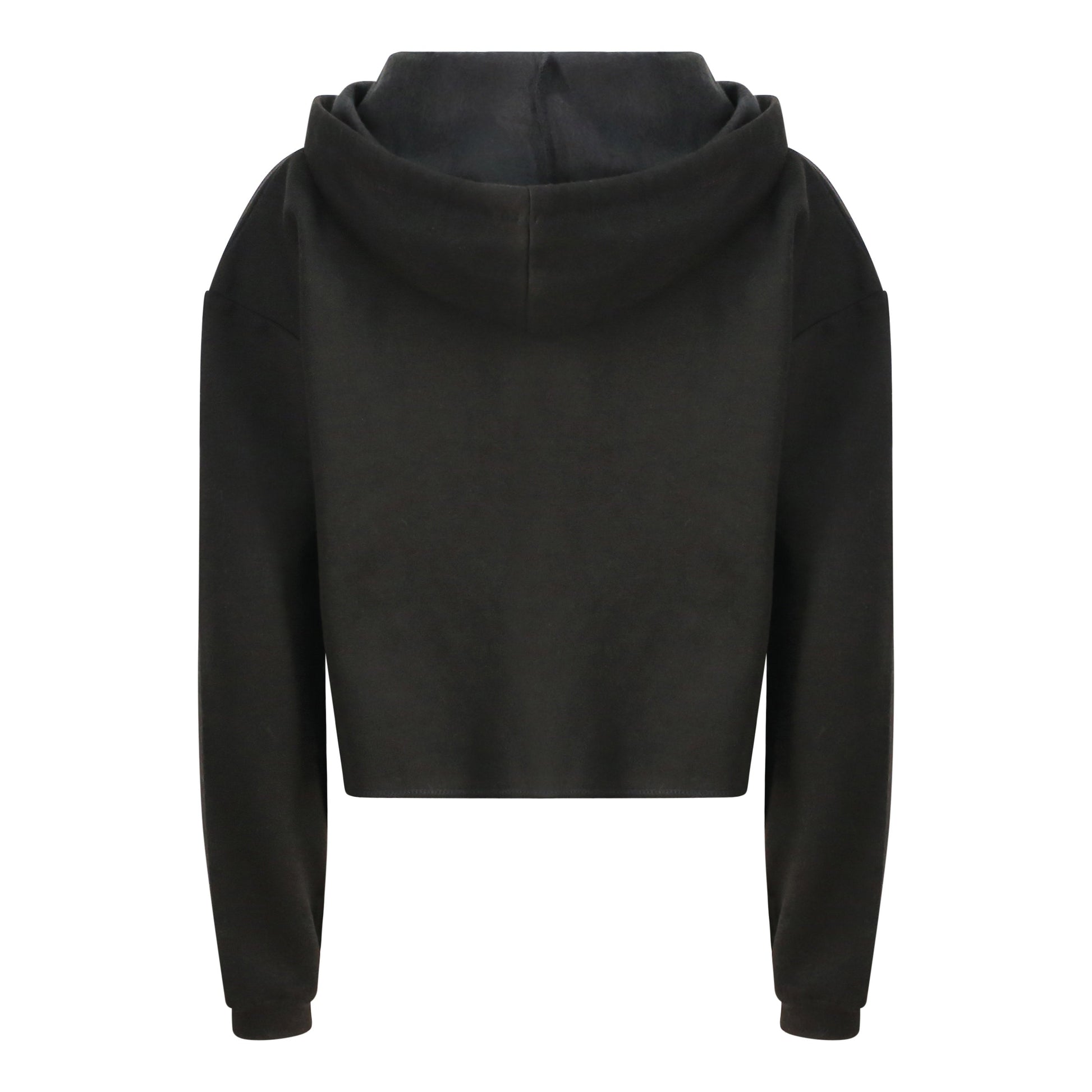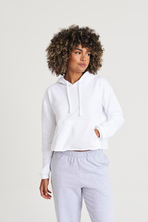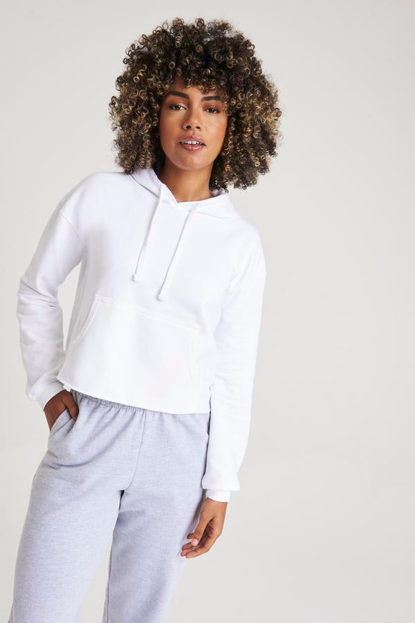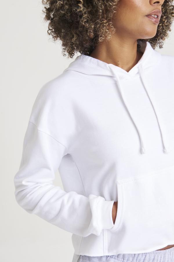 Girlie relaxed fit. Cropped cut with drop shoulder design. Kangaroo pouch pocket. Twin-needle stitching detail. Raw edge hem with cover stitching. Double fabric hood. Flat lace drawcords. Soft cotton faced fabric creates ideal printing surface. Simple tear-out label makes it perfect for rebranding. Brushed inner fleece. WRAP certified. SEDEX certified. Vegan certified.