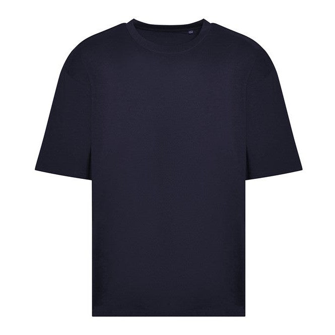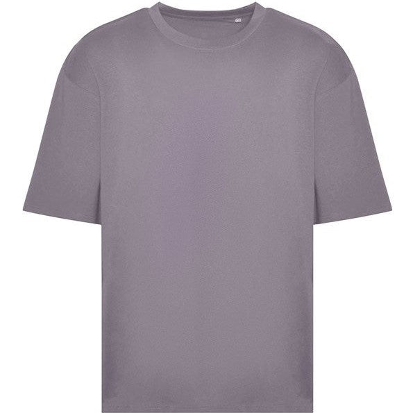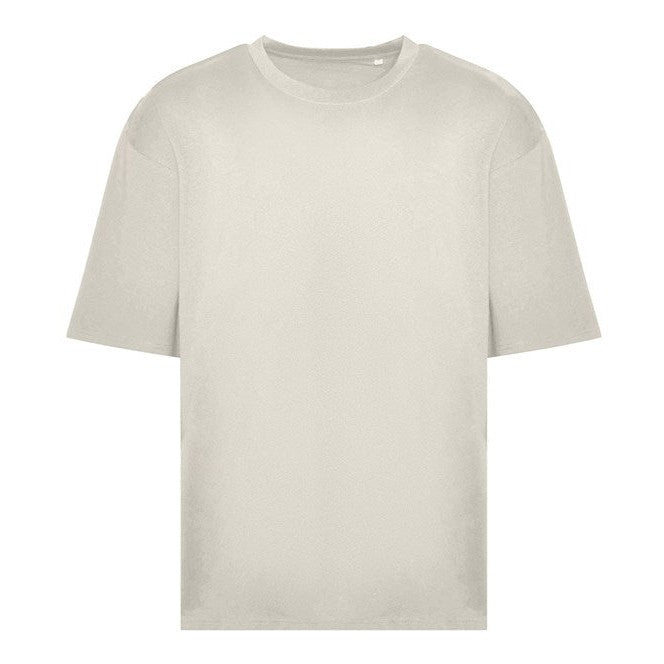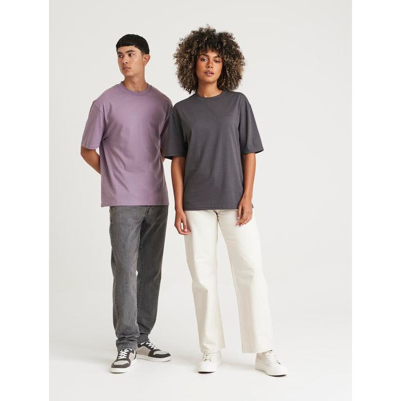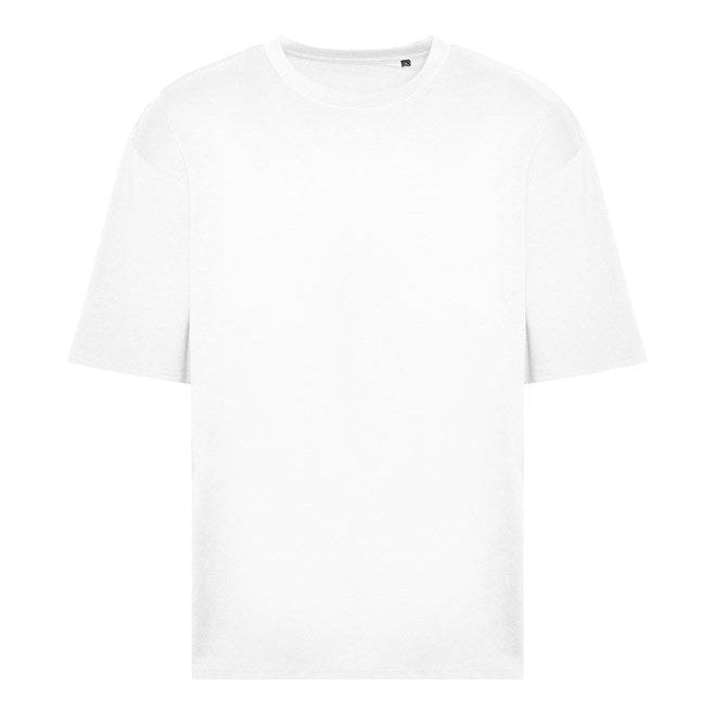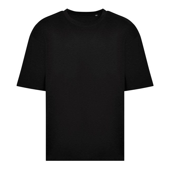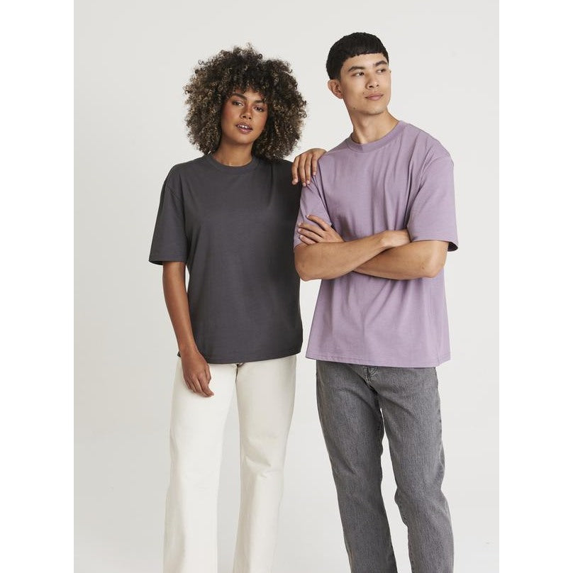 Oversized fit with side seams. Short sleeves. Ribbed crew neck style, with taped neck. Set-in sleeve. Size label only, for easy rebranding – colour-coded black for unisex. Combed ringspun cotton for ultra comfort. Surface excellent for print or embroidery. Twin-needle stitching detail on sleeves and bottom hem. Vegan certified.