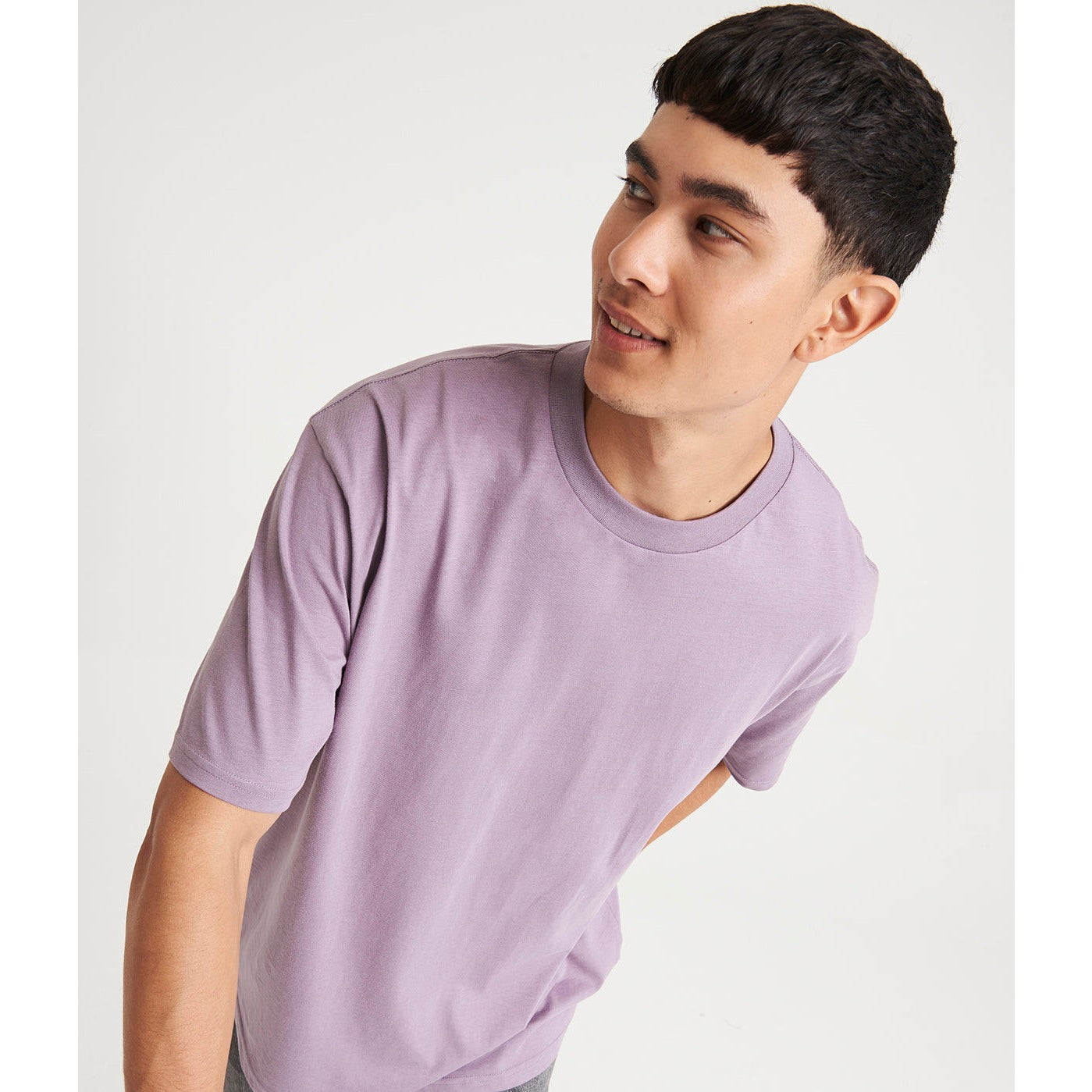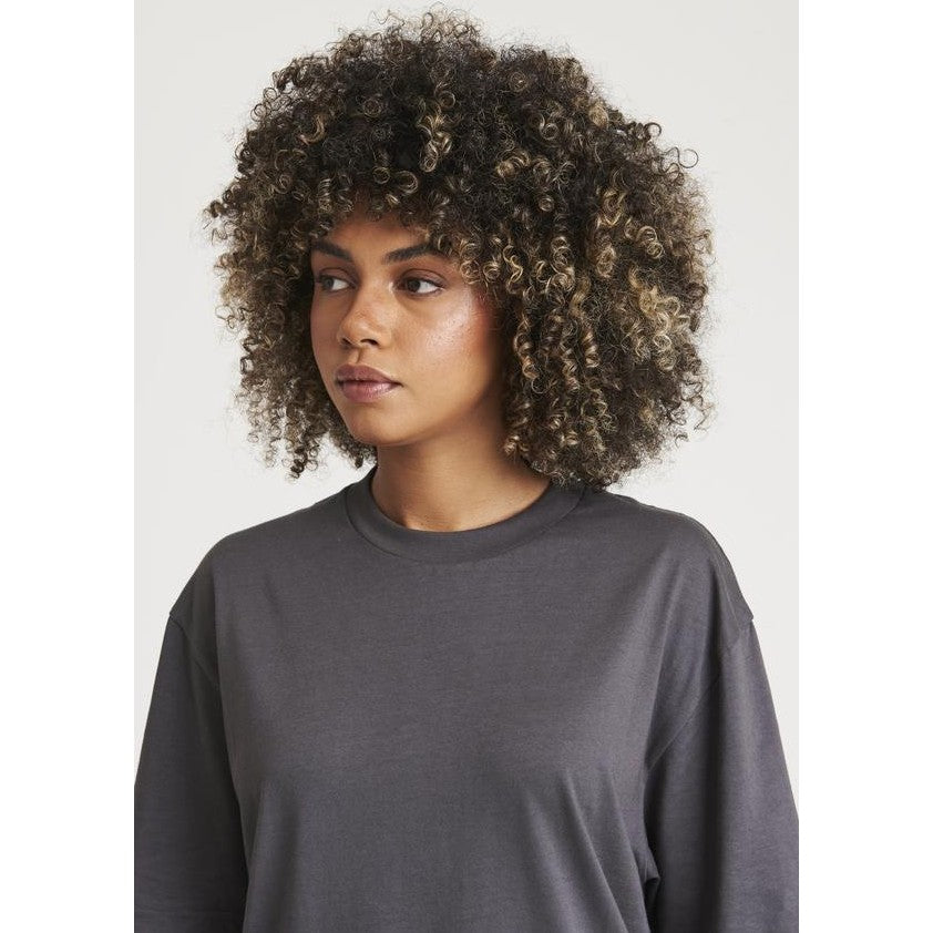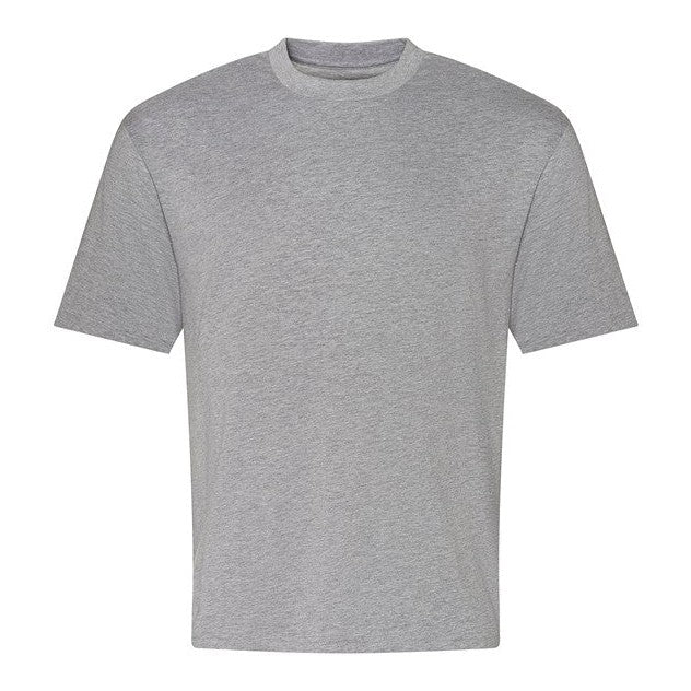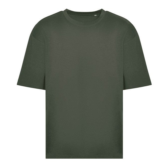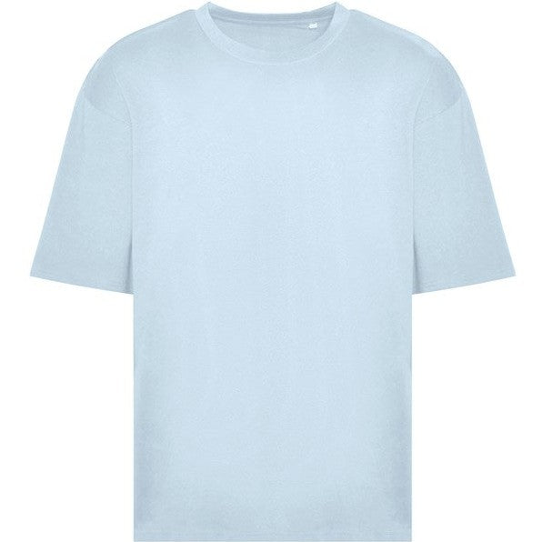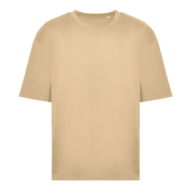 Oversized fit with side seams. Short sleeves. Ribbed crew neck style, with taped neck. Set-in sleeve. Size label only, for easy rebranding – colour-coded black for unisex. Combed ringspun cotton for ultra comfort. Surface excellent for print or embroidery. Twin-needle stitching detail on sleeves and bottom hem. Vegan certified.