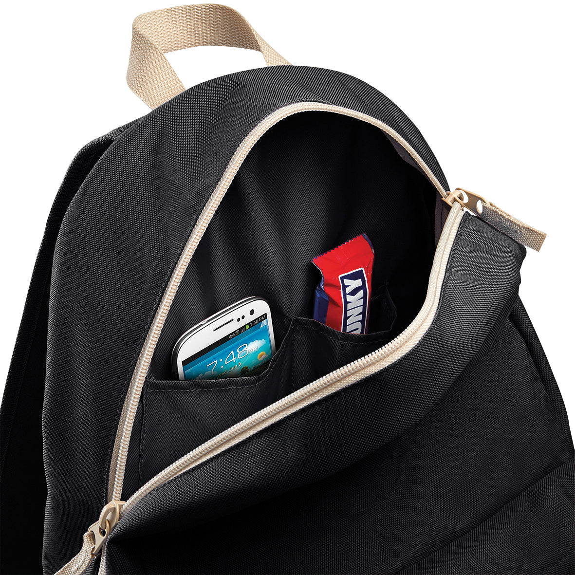- Zipped front pocket