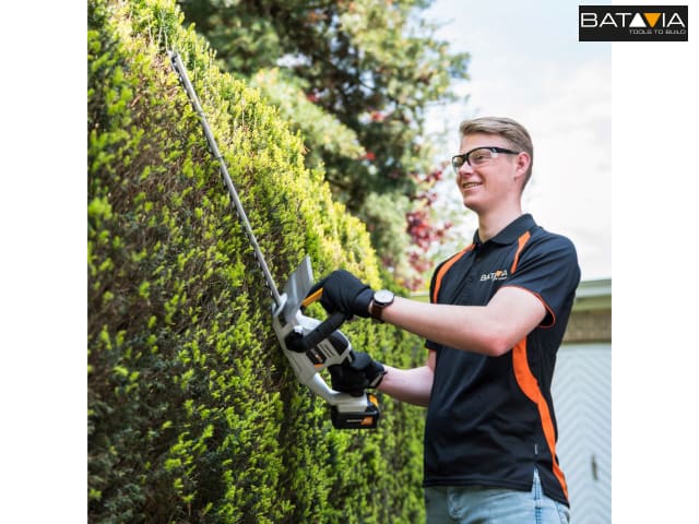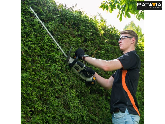 The Batavia MAXXPACK Hedge Trimmer is ideal for maintaining and sculpting hedges and shrubs. Cordless design provides unrestricted movement and eliminates the risk of accidentally cutting a cord. It has a lightweight design for optimal comfort. Fitted with a 2-hand safety switch and hand protection. When one hand is released from the tool, the machine automatically stops, ensuring user safety.