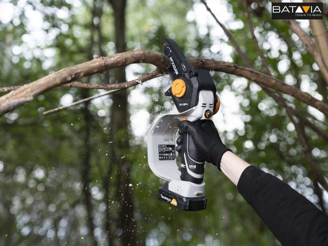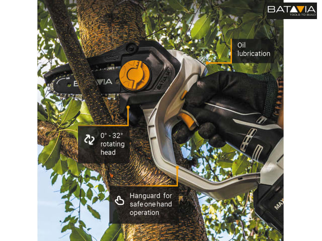 The Batavia NEXXSAW 6in Chainsaw allows you can cut branches and saw wood, quick and easily. Ideal for pruning. Its head can be rotated between 0°-32°. Use the 0° straight setting when you are working above your head, pruning higher branches. The 32° is perfect for when you are working in front of you, sawing downwards.