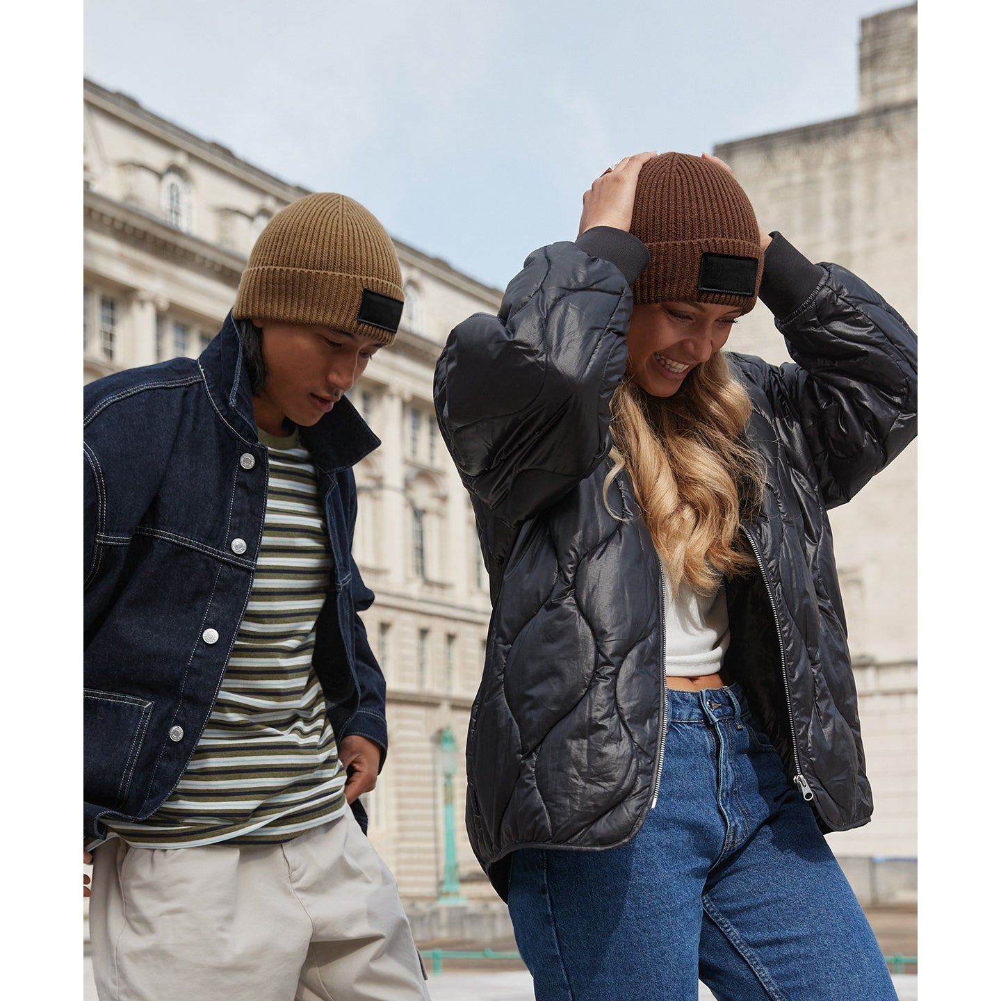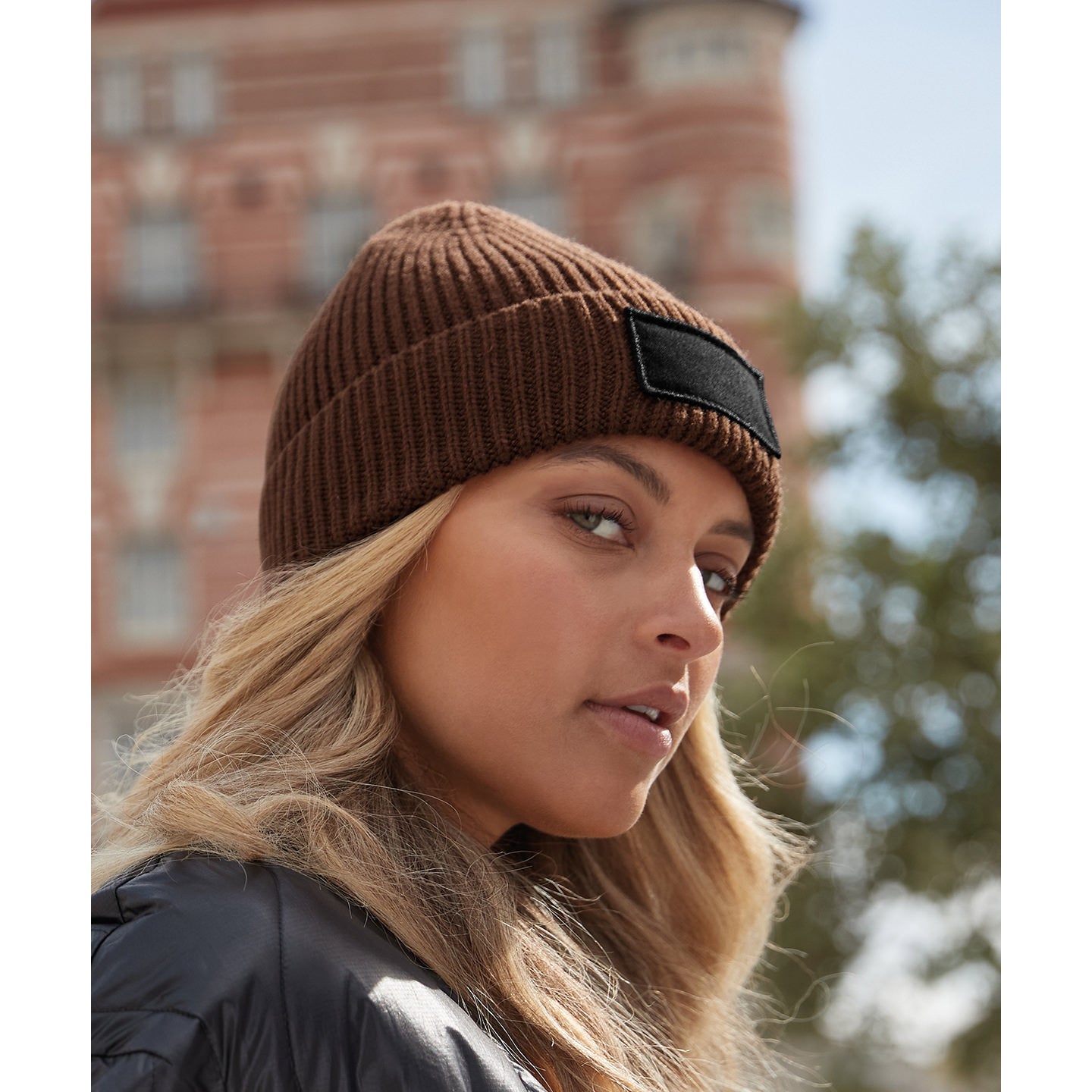 Contains at least 50% recycled polyester. Recycled polyester made from 100% rPET, equivalent to approx. 1.5 post-consumer bottles. Ribbed knit. Single-layer knit. Engineered crown for maximum comfort. Cotton twill patch for decoration. Cuffed design for optimal decoration. TearAway label for easy rebranding.