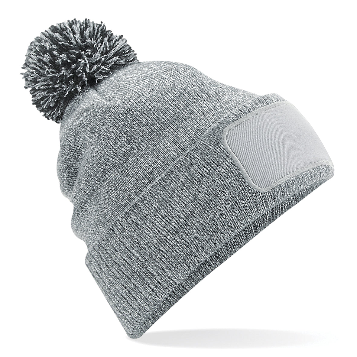 Tear-out label for ease of rebranding. Two-tone pom pom. Double-layer knit. Ribbed cuff. Cotton twill patch for printing. Reach certified.