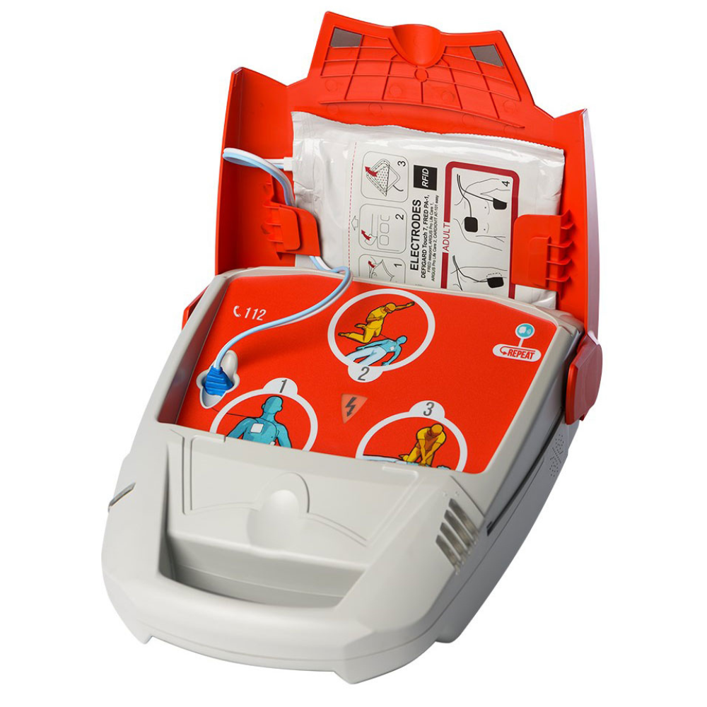 The device recognises which pads are attached and adjusts shock energy for adults or children. Clear voice prompts, simple illustrations, and a repeat button guide the user every step of the way. It performs rapid heart analysis while pre-charging, delivering shocks automatically when required.