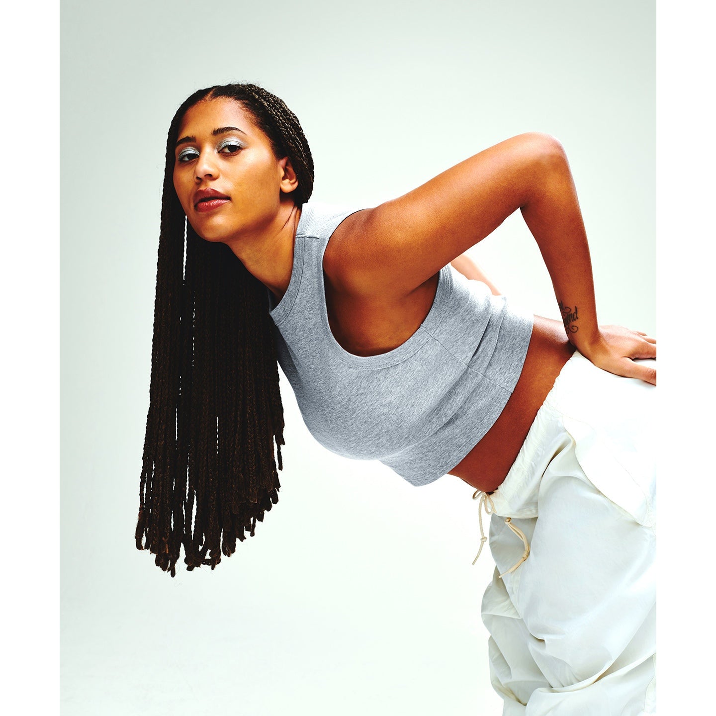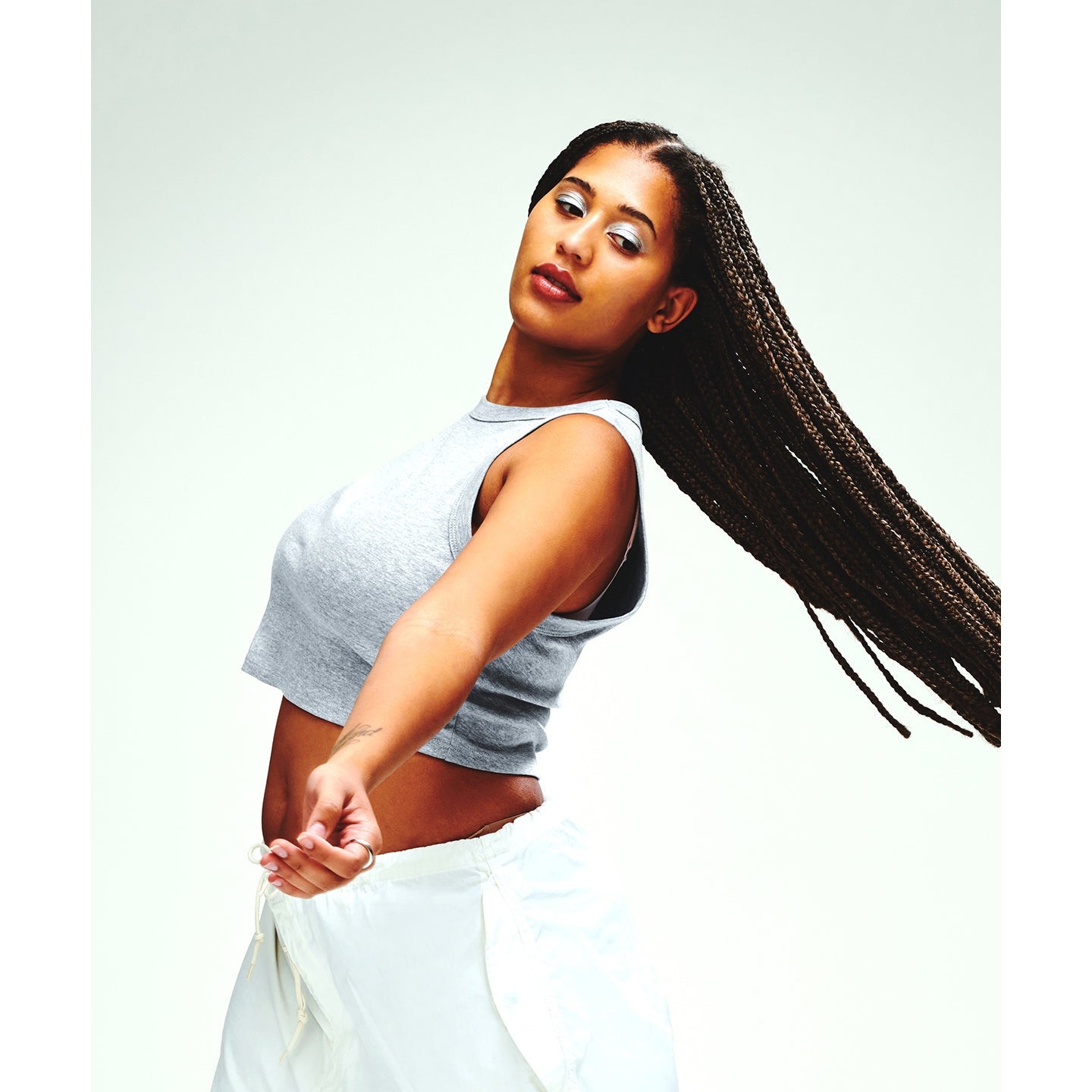 Flex in the women’s micro rib muscle crop tank, equipped with deep armholes for elevated appeal and movement, along with a fitted 1x1 micro rib fabrication that takes comfort from good to great. This cropped high-neck style, inspired by ‘90s cut-offs, takes the new age seriously with the finest fabrication and added feminine silhouette.