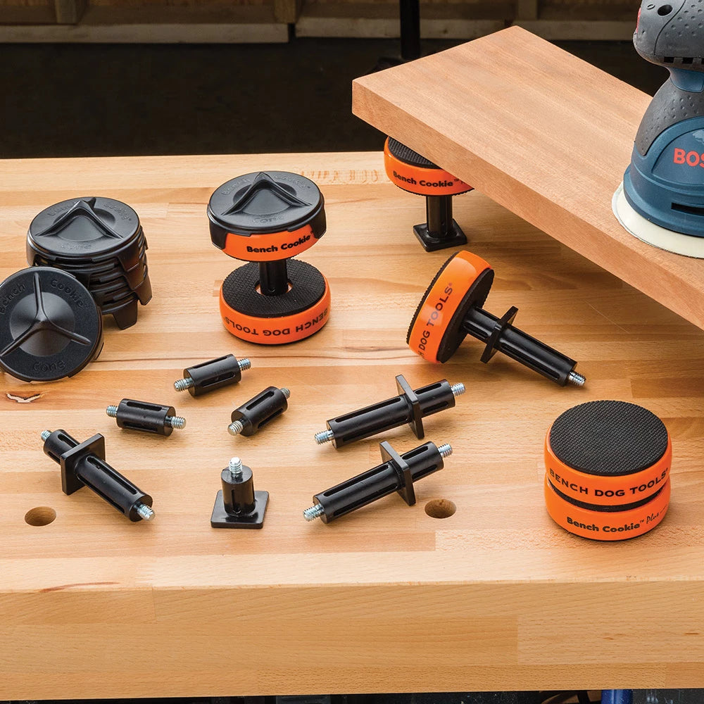 Complete kit for gripping and protecting workpieces. Use Bench Cookie® Plus Work Grippers alone to grip and protect workpieces. Can also be used with the included standard risers and XL risers to fix to dog holes or to allow space for a router bit or jigsaw blade beneath the workpiece. Includes 8 x Bench Cookie® Plus Work Grippers, 4 x risers, 8 x extra-long risers and 8 x Bench Cookie® finishing cones.