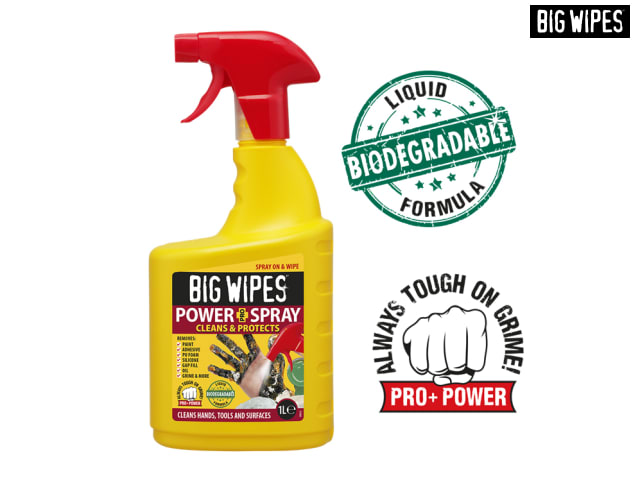 Big Wipes Power Spray Pro+ is a powerful, fast-acting, biodegradable, antiviral and antibacterial specialist cleaning solution which contains the PRO+ grime-busting formula as used in all Big Wipes. The unique formulation contains four cleaning detergents to guarantee the quick and effective breakdown and removal of unwanted muck and grime such as; paint, adhesives, oil, sealants, silicone's, gap fill, PU foam and more from hands, tools and surfaces. Ideal for pre-treating large surface areas such as; walls, doors, floors, counters, equipment/machinery, worktops or window frames before wiping clean.