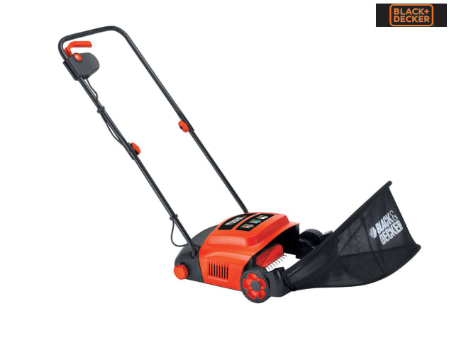 The BLACK + DECKER GD300 Lawnraker is suitable for medium gardens and has a 30cm raking width with a rear roller and 3 raking heights for year round maintenance. The raking mechanism has metal tines. A large capacity, front loading grass box provides easy collection and disposal of debris. Central height adjustment system for speed and ease of use.