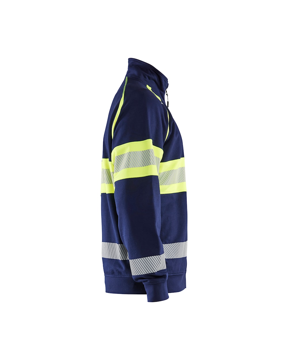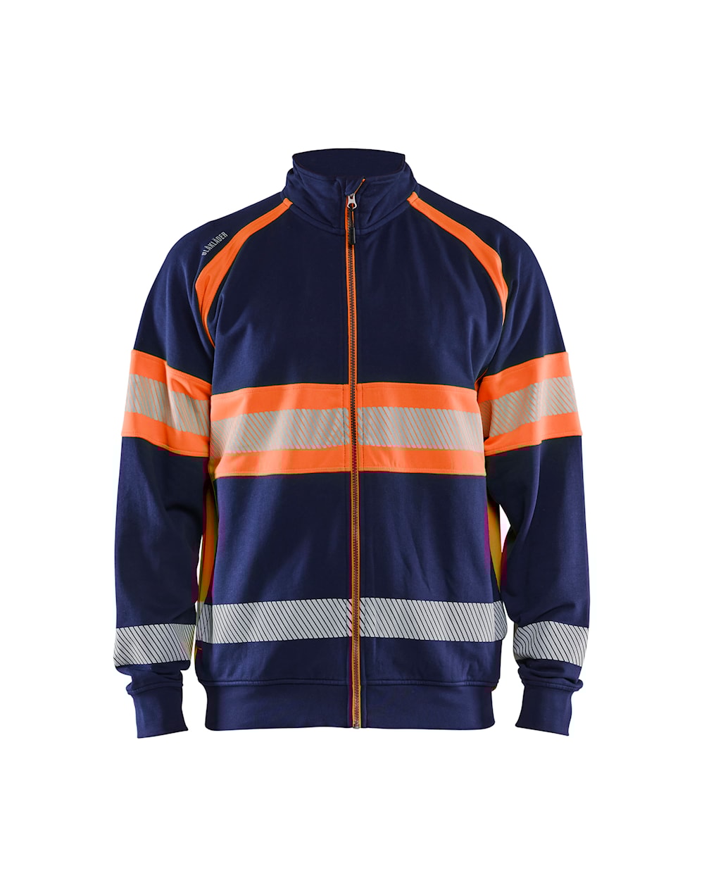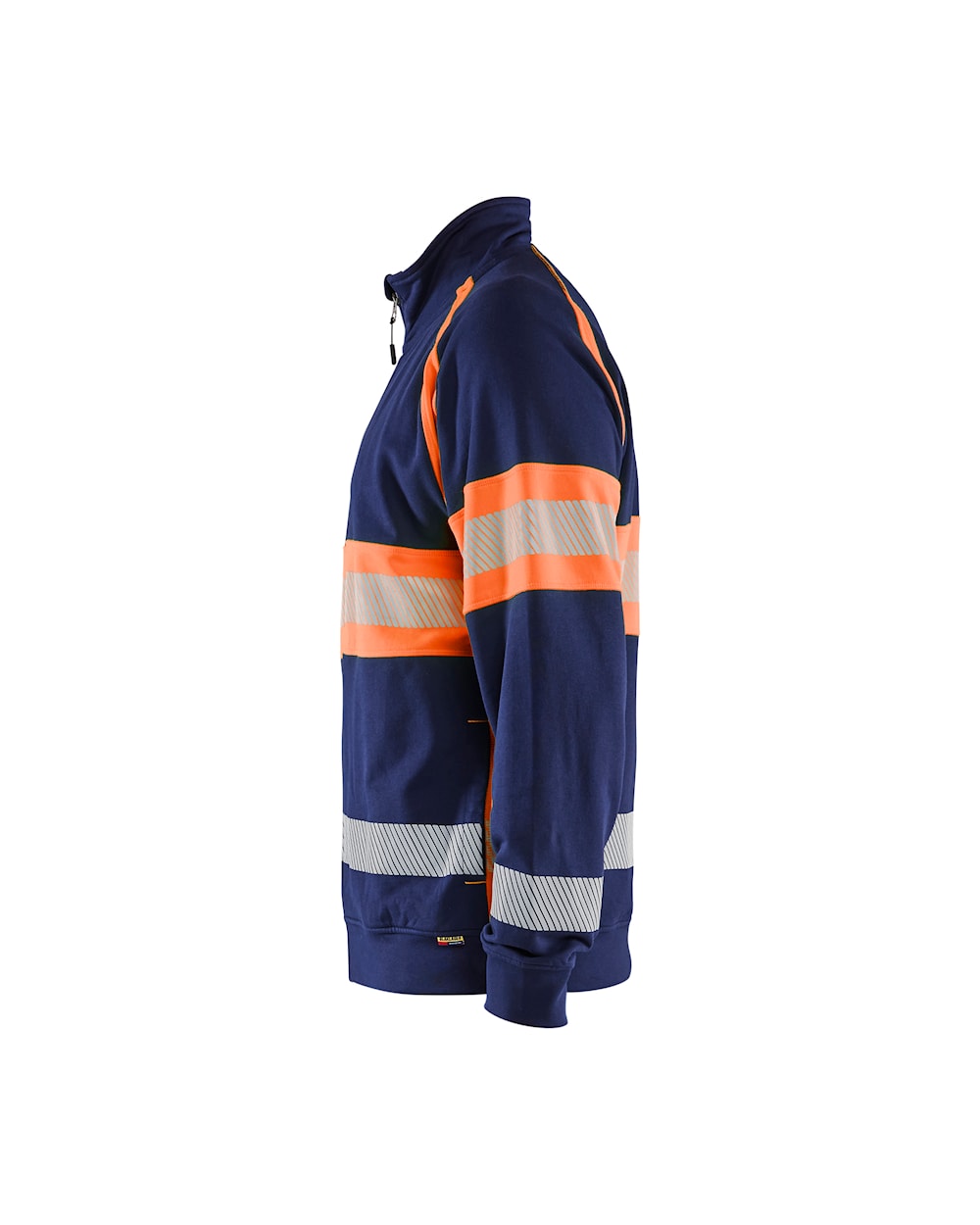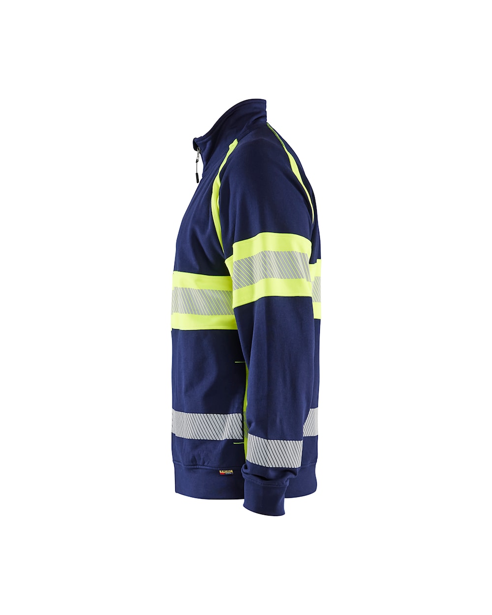 Soft and comfortable Hi-vis sweater in lovely cotton quality with cut reflective tape for extra good stretch abilities and breathability. Has pockets on the sides, high collar, full zip at the front and cuffs at the bottom and sleeve ends for higher comfort. The dark part of the sweater consists of 100 per cent cotton, and the Hi-vis part is made of 100 per cent polyester. Certified according to EN ISO 20471, class 1.