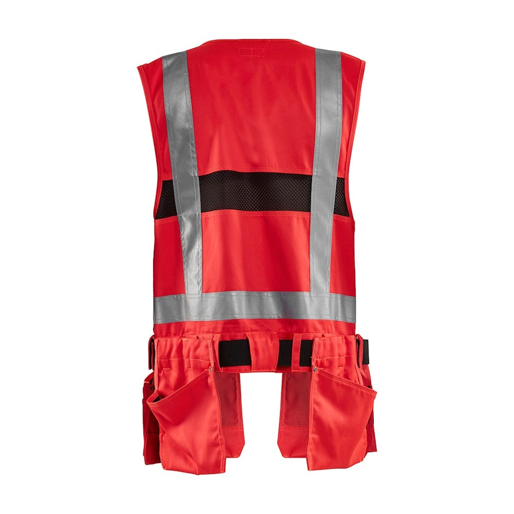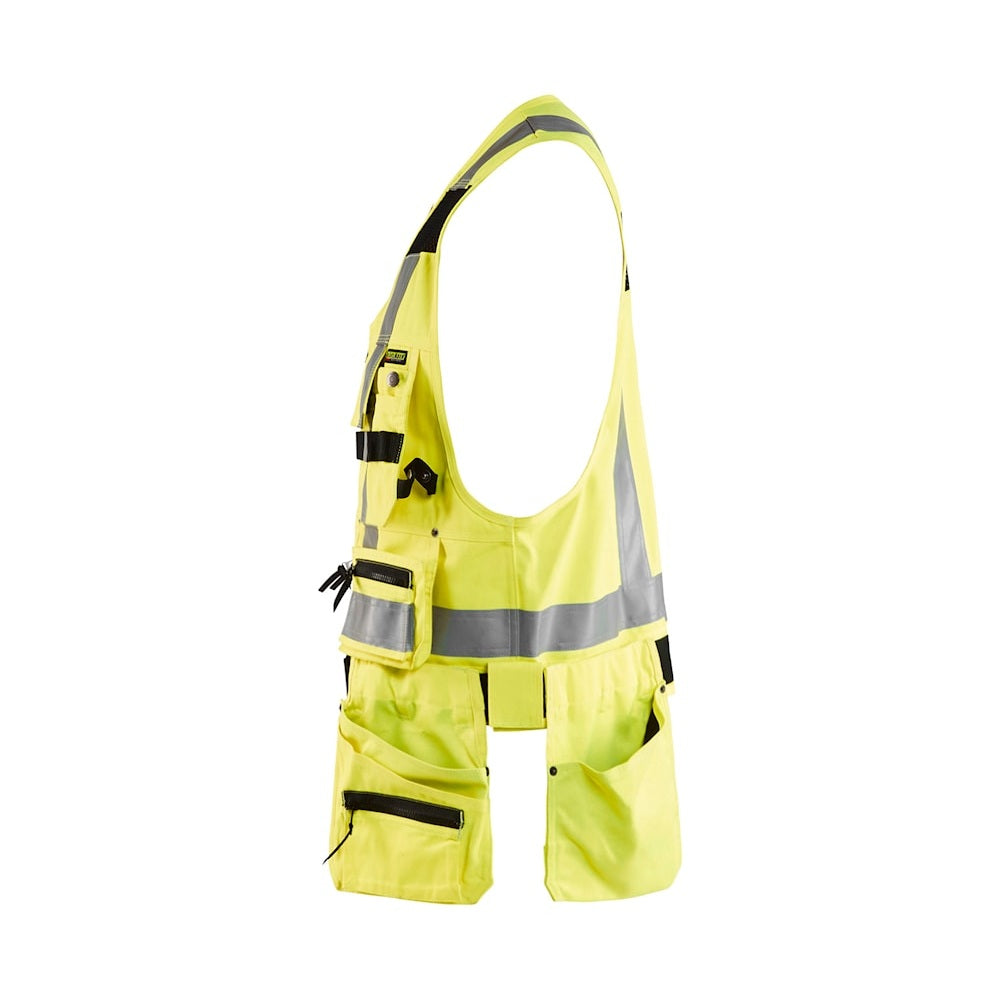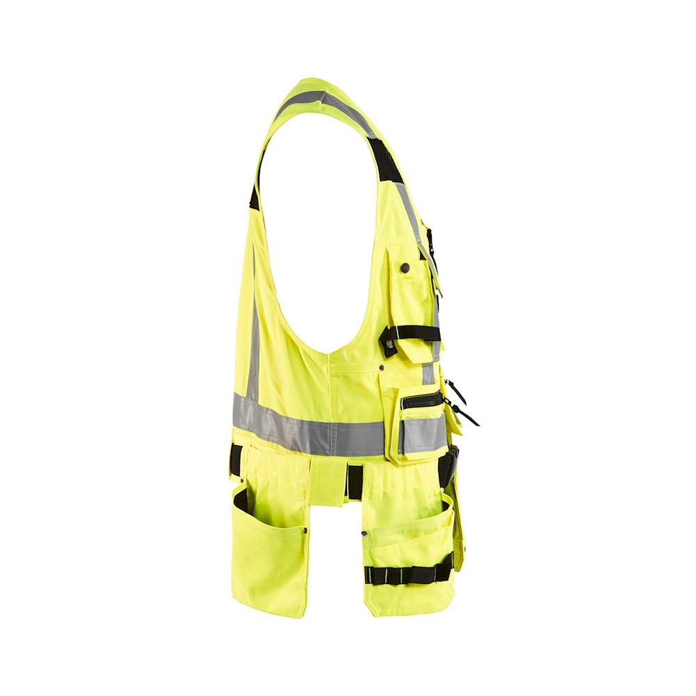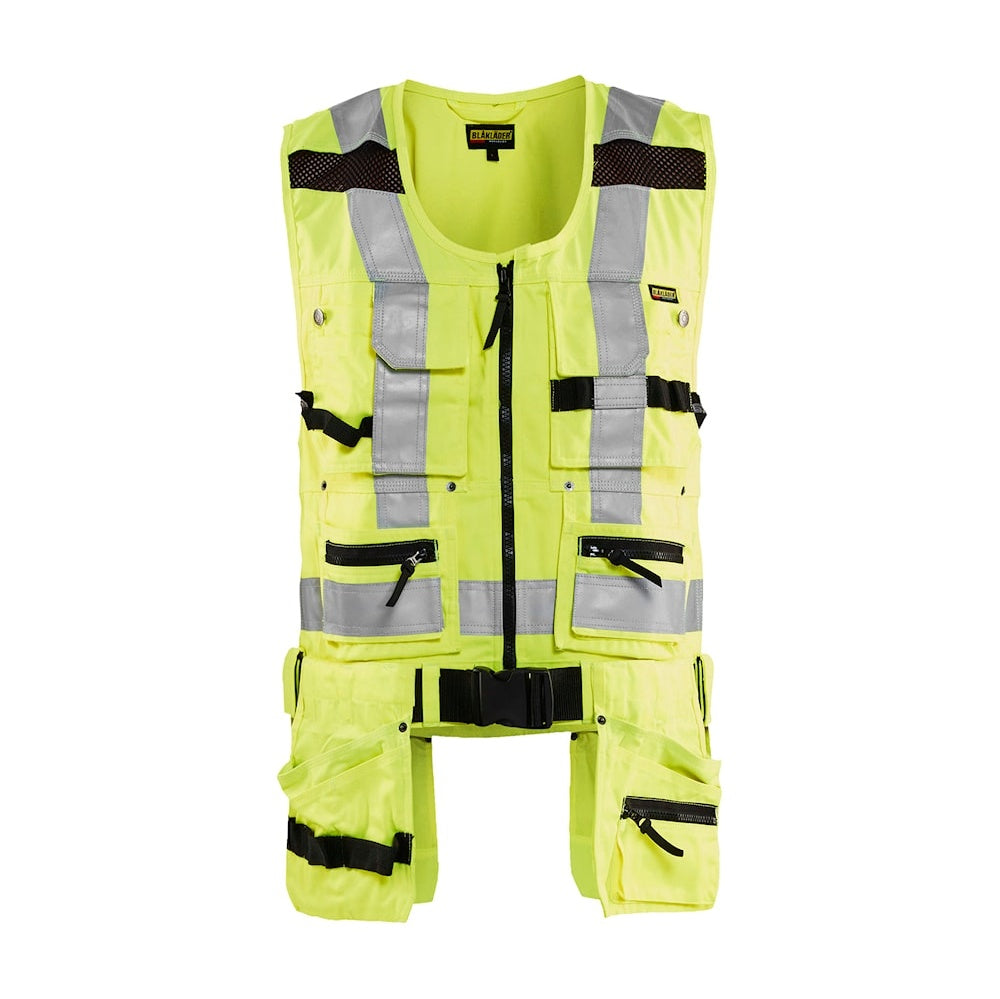 Modern craftsman waistcoat with many practical pockets for tools and accessories. Detachable nail pockets and waist strap to reduce shoulder and neck strain. It even has double zippers at the front to adjust the width, which provides a better fit and improved comfort. Mesh panels that make the waistcoat light and provide good ventilation. Certified according to EN ISO 20471, S class 1, M-4XL class 2.