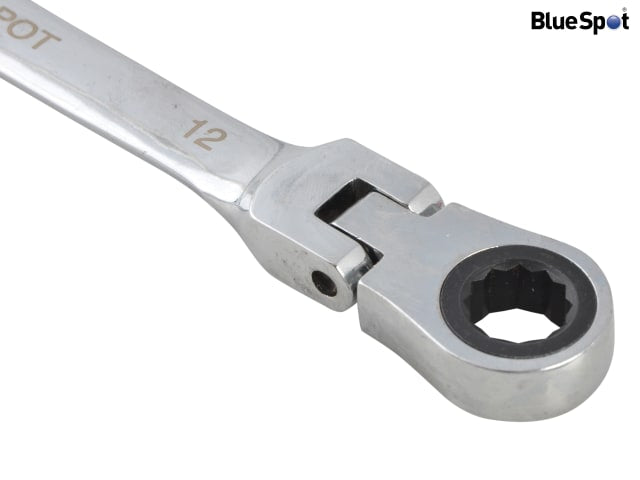 The BlueSpot Flexible Ratchet Spanners feature 180° pivoting ratchet ring heads. Manufactured from chrome vanadium steel, heat treated and nickel plated for increased durability. They have a fully polished mirror finish. With 8° ratcheting increments to make the set ideal for use in tight spaces.