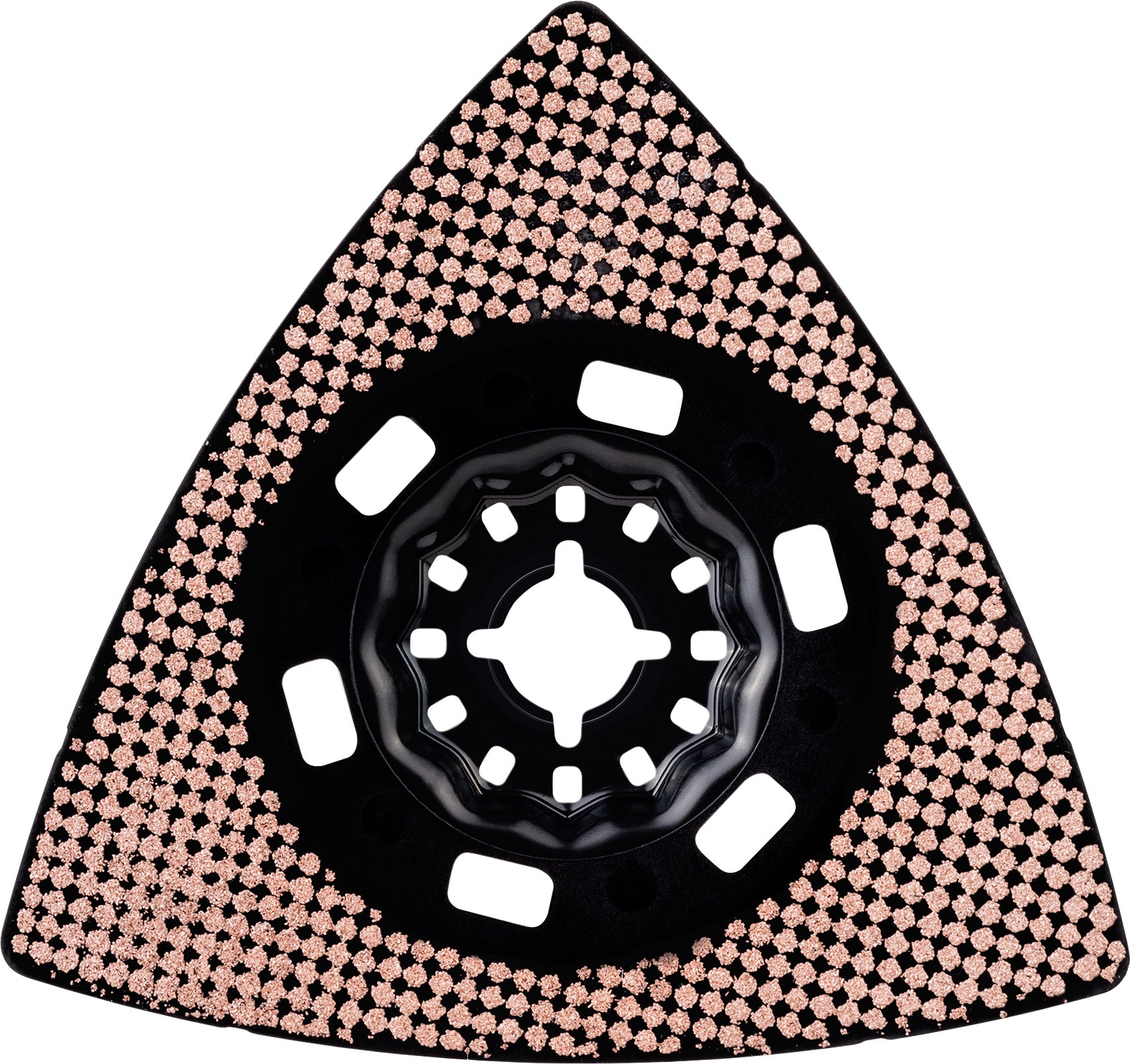 The Starlock AVZ 90 RT10 Carbide RIFF Sanding Plate provides extra-long life performance on mortar and tile adhesive. The plate is coated with high-quality carbide with grit 100 for high wear resistance, providing it exceptionally extended usage. Its open-coat carbide coating allows for aggressive material removal without clogging or buildup, allowing the plate to last longer. Moreover, its delta-shaped plate allows it to reach tight corners. This plate is ideal for all sanding and rasping applications on wooden materials. The mounting system produces the highest power transfer thanks to a 3-dimensional tight-fitting connection between machine and accessory. It is suitable for use with all Starlock, Starlock Plus and Starlock Max power tools as well as common multi-tools.