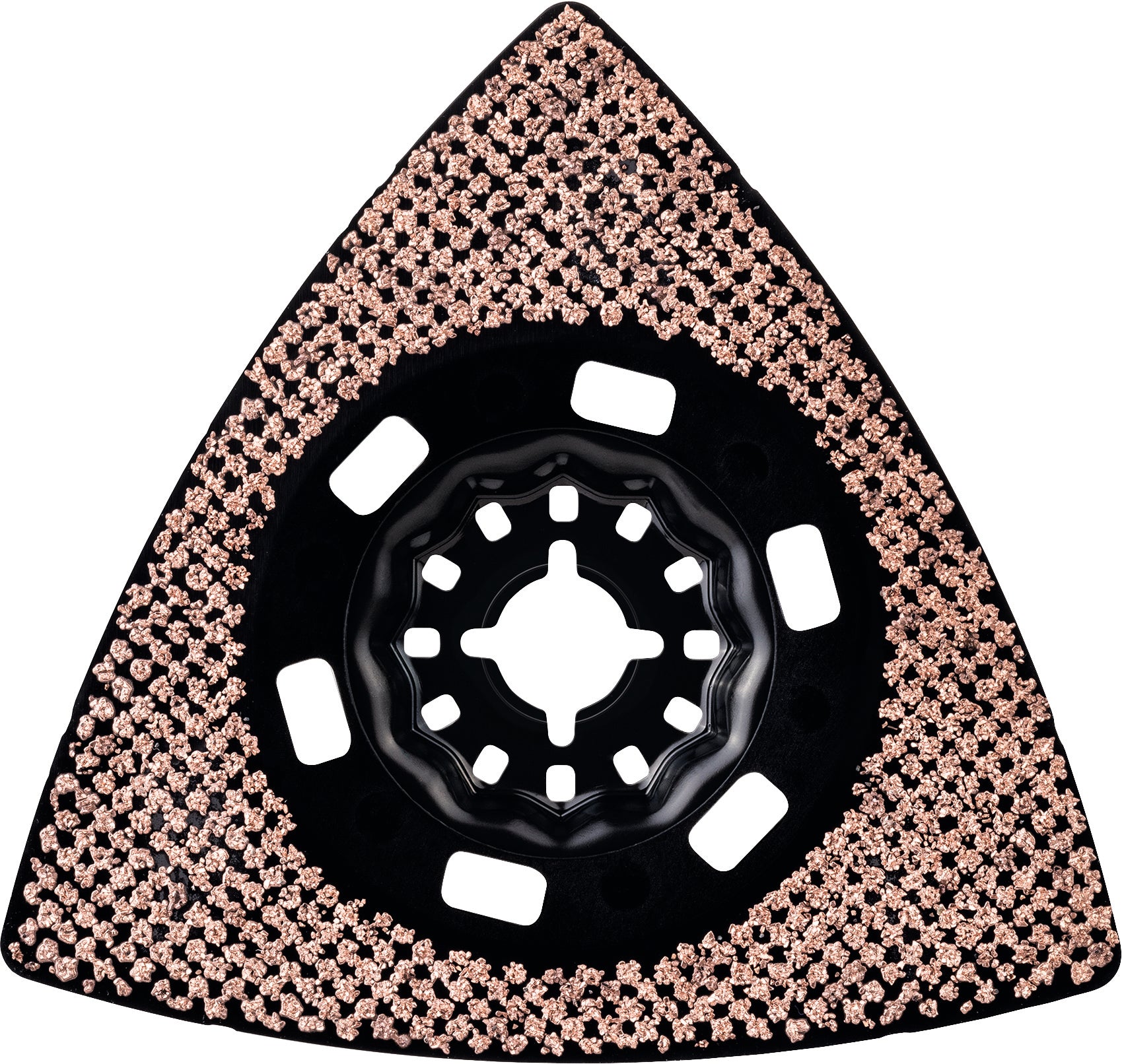 The Starlock AVZ 90 RT6 Carbide RIFF Sanding Plate provides extra-long life performance on mortar and tile adhesive. The plate is coated with high-quality carbide with grit 60 for high wear resistance, providing it exceptionally extended usage. Its open-coat carbide coating allows for aggressive material removal without clogging or buildup, allowing the plate to last longer. Moreover, its delta-shaped plate allows it to reach tight corners. This plate is ideal for removing thick layers of paint from wooden materials and for rasping weathered wood. The mounting system produces the highest power transfer thanks to a 3-dimensional tight-fitting connection between machine and accessory. It is suitable for use with all Starlock, Starlock Plus and Starlock Max power tools as well as common multi-tools.