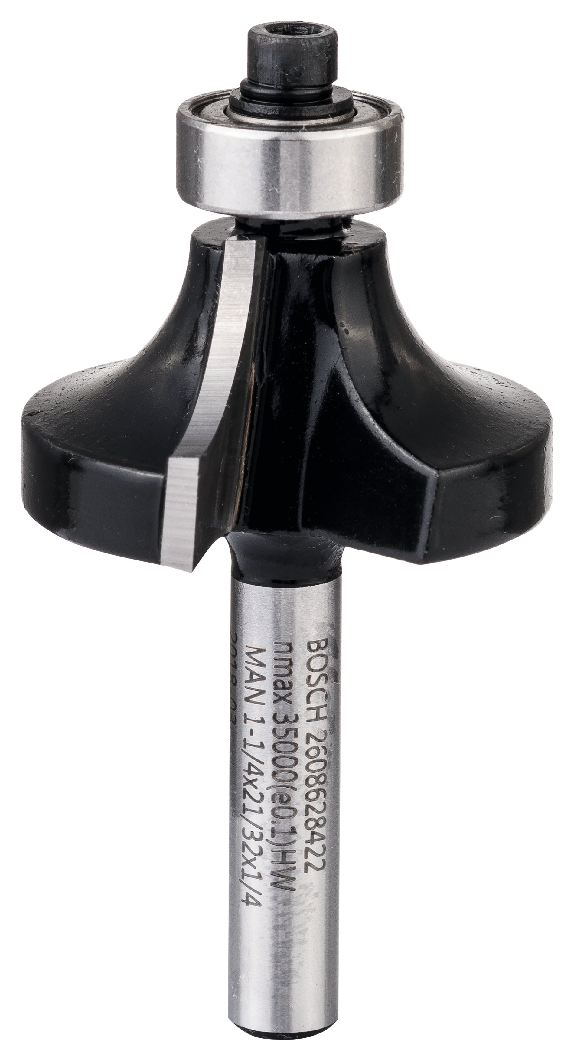 The Standard for Wood Rounded Over Bit delivers a high cutting performance when creating edge roundings. Durability and reliable cutting results are achieved by its high-quality tungsten carbide cutters. Furthermore, the bit prevents kickbacks by limiting the thickness of the generated chips. It is intended for easy-guided edge roundings as well as decorative applications in soft and hard solid wood and wood composites. The ball bearing allows for easy guiding directly on the workpiece without a side fence. It is suitable for use with handheld-routers and table-mounted portable routers.