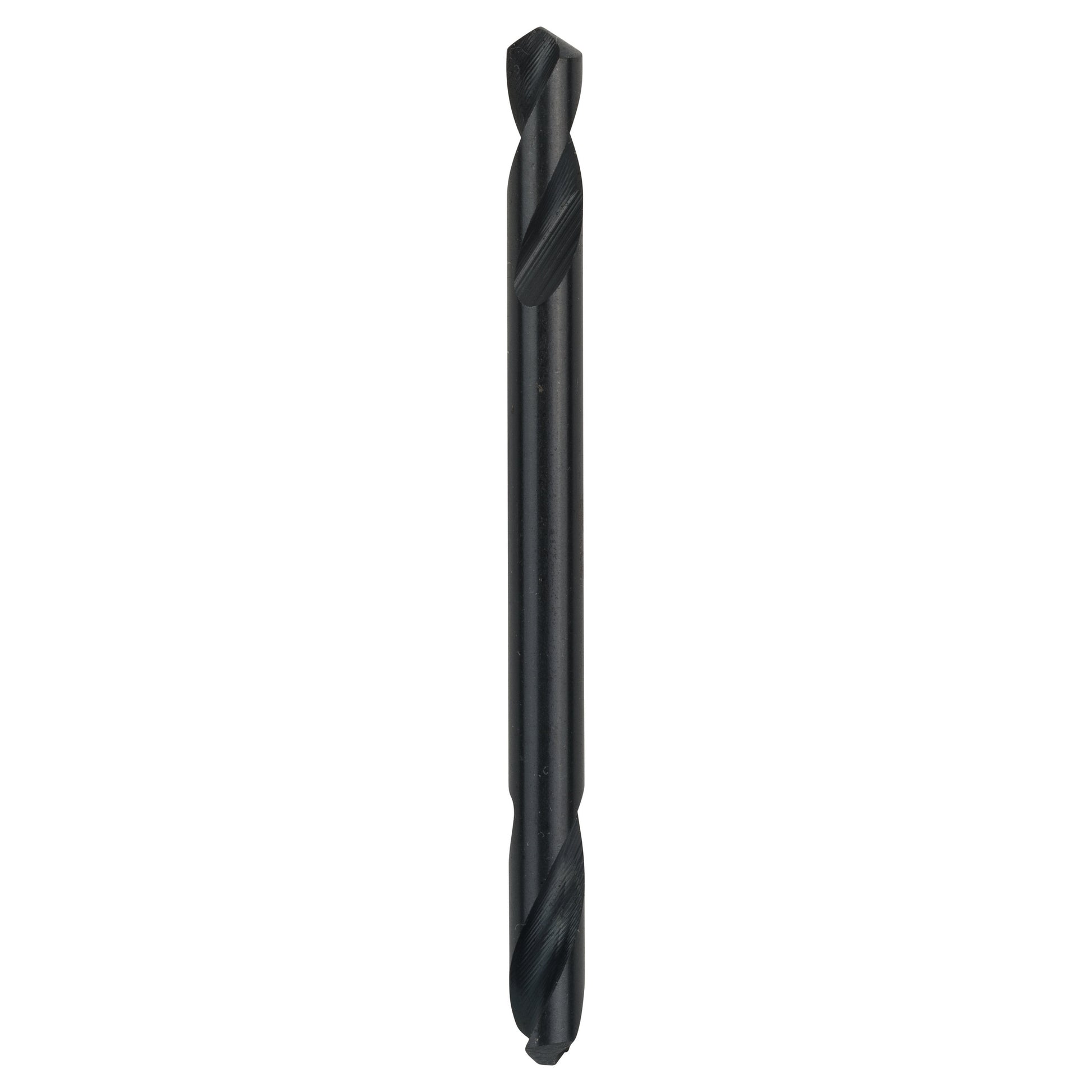 The HSS Double-Ended Drill Bit Ground delivers double the drilling lifetime. The bit is usable at both ends due to two drill bit tips and flutes. It is ideally suited for assembly work, car body work and metal machining. It can also be used for drilling rivets or thread holes in thin-walled materials. Use this bit when drilling non-ferrous metal, sheet steel and plastics. Additionally, the bit is extra short and stable for drilling in confined spaces. Active cutting and perfect centring without wandering are achieved by the pointed split-point tip, making pre-punching unnecessary. It is intended for handheld drills (drill drivers) and drill stands.