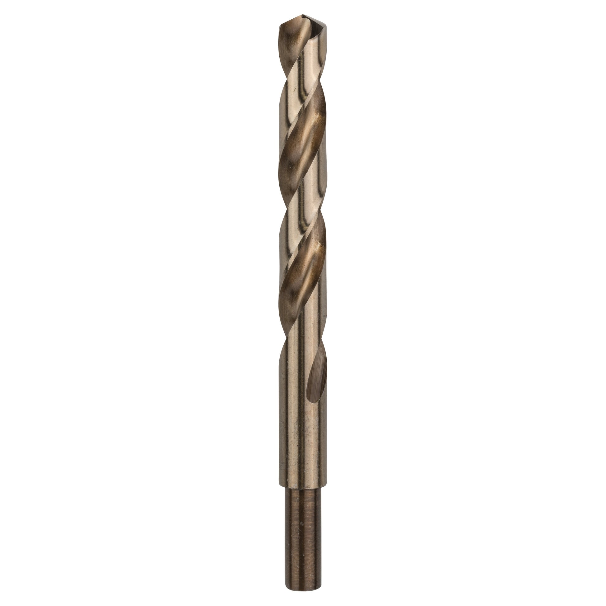 The HSS Twist Drill Bit Cobalt provides long-lasting performance when drilling stainless steel. This extended lifetime results from a cobalt alloy content of 5% and fully ground HSS (high-speed steel), which provides excellent surface quality, wear resistance and heat protection. Equipped with two cutters and two flutes, chips are removed quickly to make the bit last even longer. This drill bit works with alloyed and non-alloyed steel, stainless steel, cast iron, cast steel and acid- and heat-resistant steels. The HSS Twist Drill Bit Cobalt is manufactured to DIN 338. The drill bit is Type N (flute angle) with a 135-degree tip and a diameter tolerance of h8. Active cutting and perfect centring without wandering are achieved by the pointed split-point tip. This drill bit works with alloyed and non-alloyed steel, stainless steel, cast iron, cast steel and acid- and heat-resistant steels. It has a cylindrical shank system (shank equal to drill bit diameter) and is intended for use in drill stands and drill drivers.