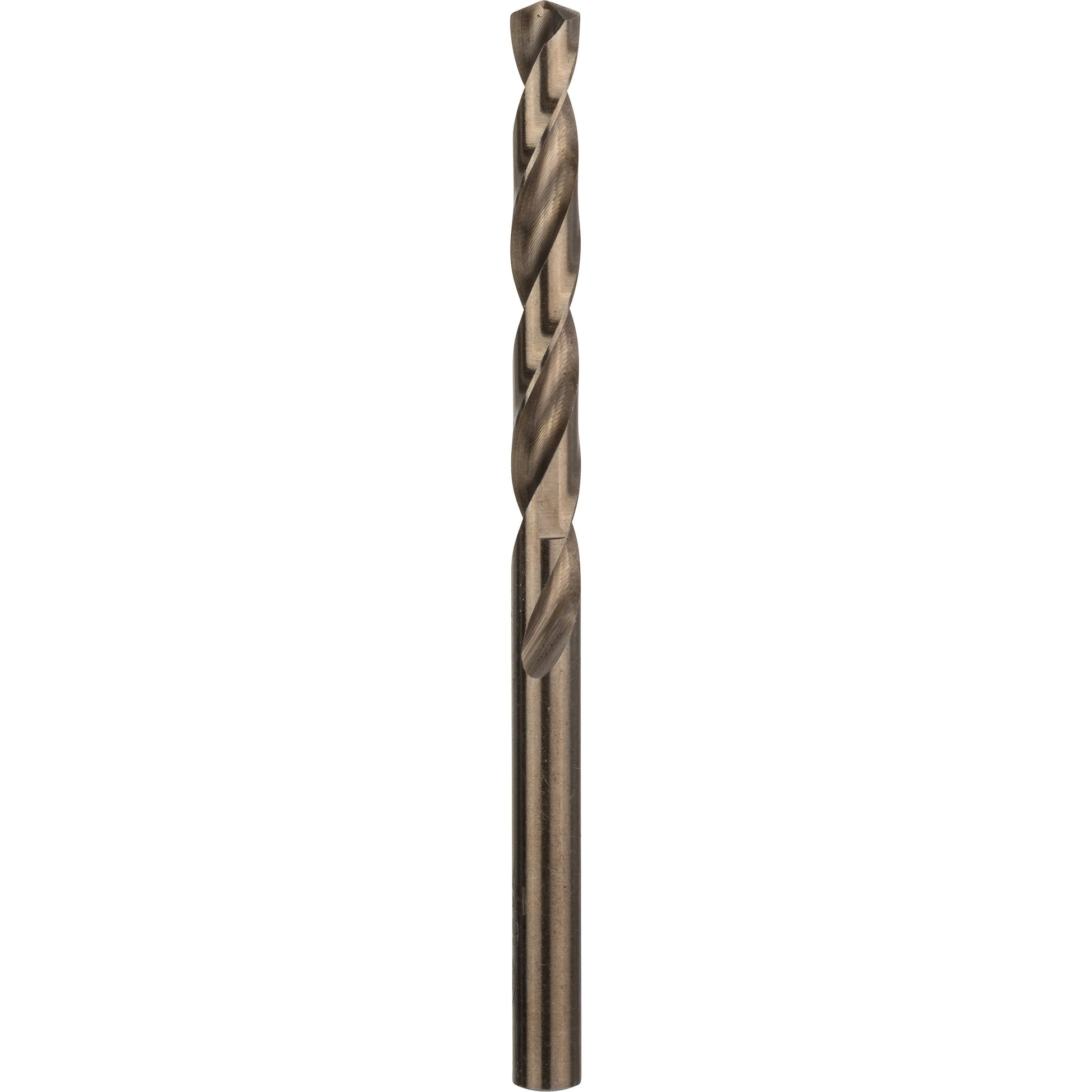 The HSS Twist Drill Bit Cobalt provides long-lasting performance when drilling stainless steel. This extended lifetime results from a cobalt alloy content of 5% and fully ground HSS (high-speed steel), which provides excellent surface quality, wear resistance and heat protection. Equipped with two cutters and two flutes, chips are removed quickly to make the bit last even longer. This drill bit works with alloyed and non-alloyed steel, stainless steel, cast iron, cast steel and acid- and heat-resistant steels. The HSS Twist Drill Bit Cobalt is manufactured to DIN 338. The drill bit is Type N (flute angle) with a 135-degree tip and a diameter tolerance of h8. Active cutting and perfect centring without wandering are achieved by the pointed split-point tip. This drill bit works with alloyed and non-alloyed steel, stainless steel, cast iron, cast steel and acid- and heat-resistant steels. It has a cylindrical shank system (shank equal to drill bit diameter) and is intended for use in drill stands and drill drivers.