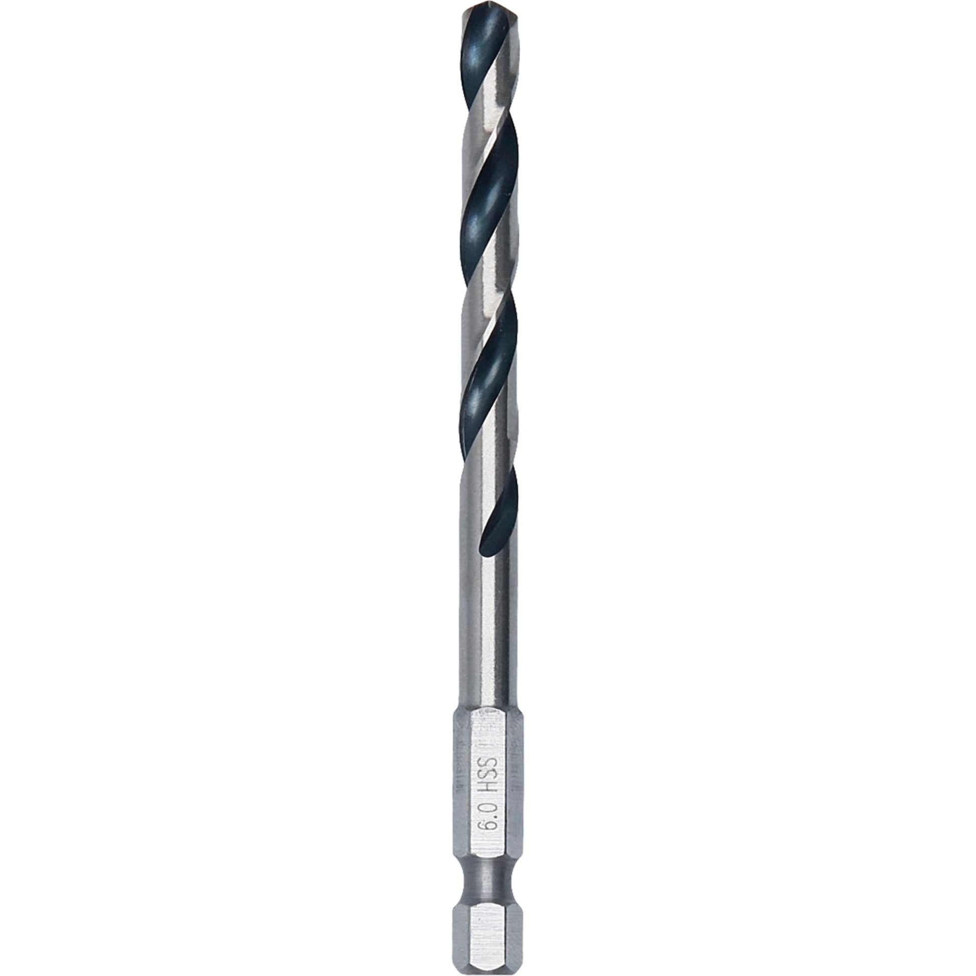 The HSS Twist Drill Bit PointTeQ with hex shank delivers fast results when drilling in metal. Designed for high-speed drilling, it generates minimal heat and bit wear, and features a PointTeQ tip design that ensures continual sharpness and high durability. Its self-centring tip prevents wandering and enables quick and easy drilling starts, while its black-oxide-coated flute provides fast chip removal. For even higher reliability, the bit´s hex shank offers stability and a firm lock between the bit and chuck, strengthening the bit´s body and reducing the risk of breakage for drill bits below 6 mm in diameter. This PointTeQ bit is suitable for drilling clearance and pilot holes in alloyed and non-alloyed steel, non-ferrous metals, cast steel, cast iron and plastics. The HSS Twist Drill Bit PointTeQ's split-point tip allows for active cutting and perfect centring. Drill bit Type N (flute angle) with 135° tip, manufactured to DIN 338. It is compatible with 1/4-inch hex-shank systems for universal use with impact drivers, drill drivers and drill stands.