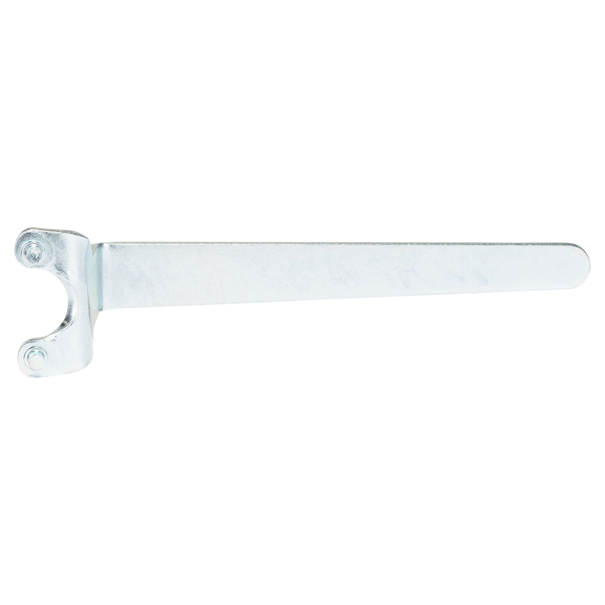 It is compatible with angle grinders. The Two-Hole Spanner tightens and loosens clamping flanges on cup wheels and is bent at right angles.