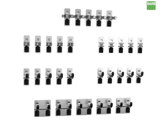 Bott Perfo Hooks have a steel construction with a fast and secure perfolock clip-on design. Suitable for use with perfo panels. Perfect for organising and neatly storing tools and components.