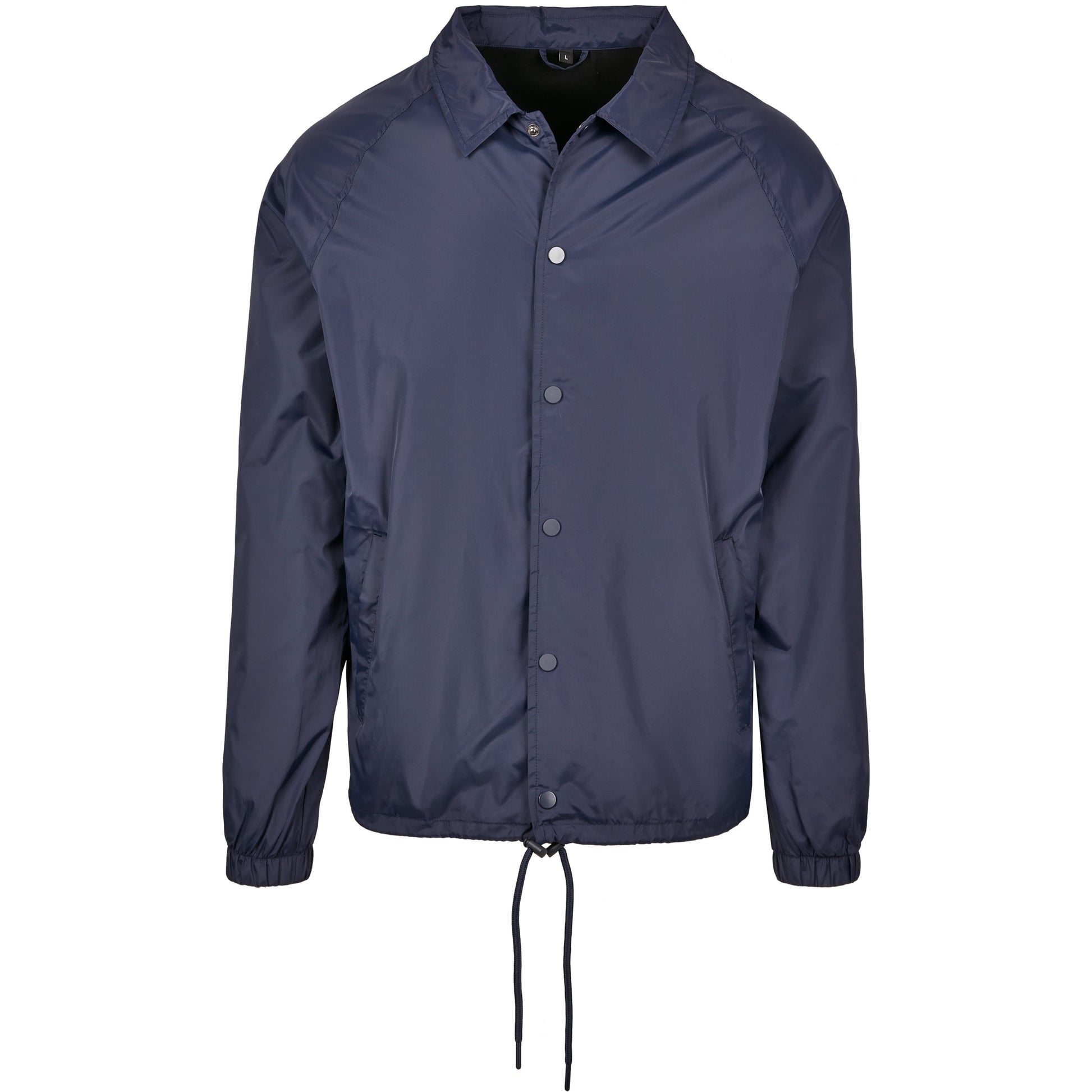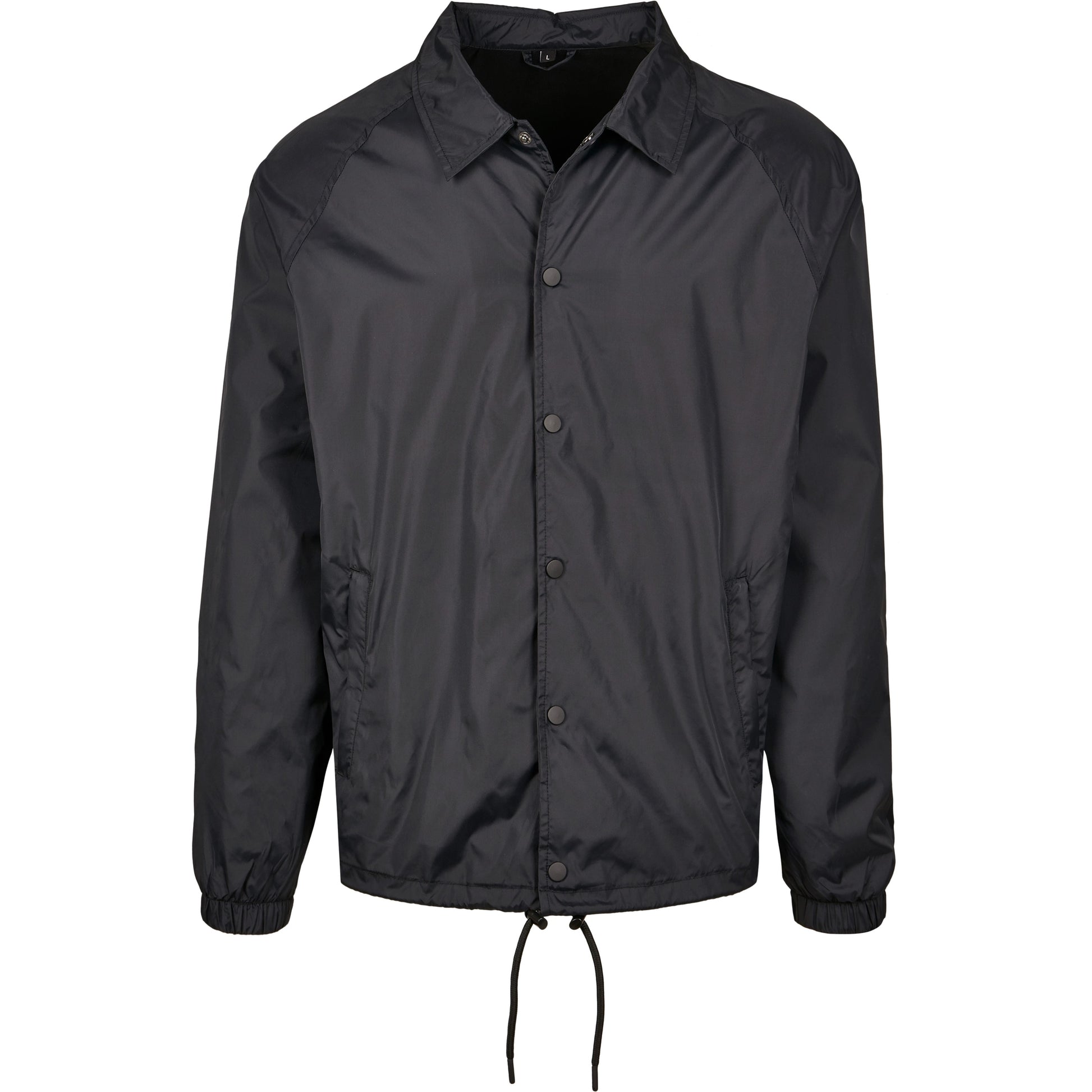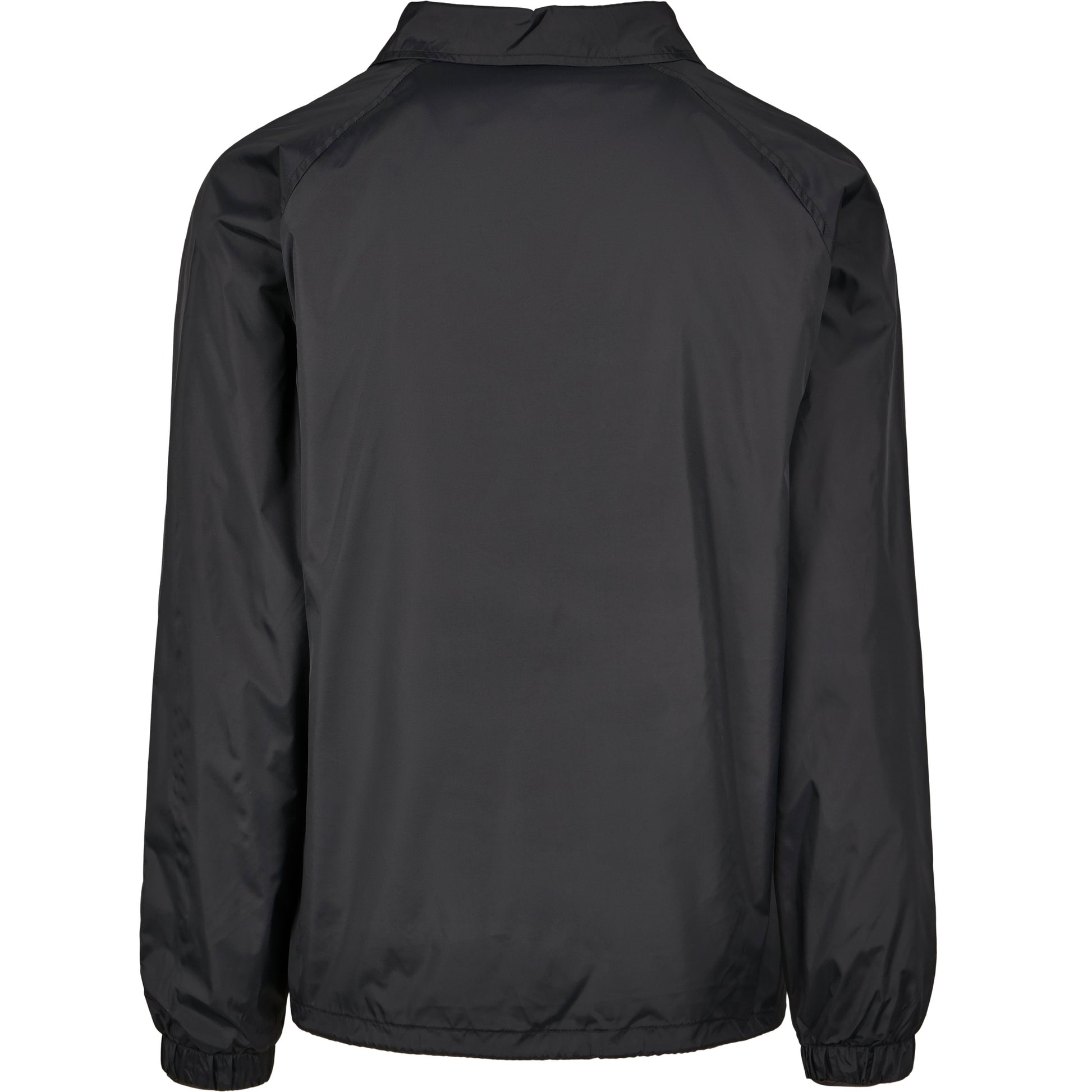 This sporty coach jacket pleases with a simple and functional design, which can be further enhanced through stitching, silk screening or flock printing. Its raglan cut with seamless shoulders in combination with the continuous press-button facing as well as the elastic cuffs turn this nice piece of garment into a real street wear style jacket. You will also get some handy side pockets and an elastic waistband with drawstring and stoppers at your disposal. The sophisticated design is rounded off by a simple yet elegant collar. The functional and robust upper is made of nylon, the lining out of cotton and taffeta.