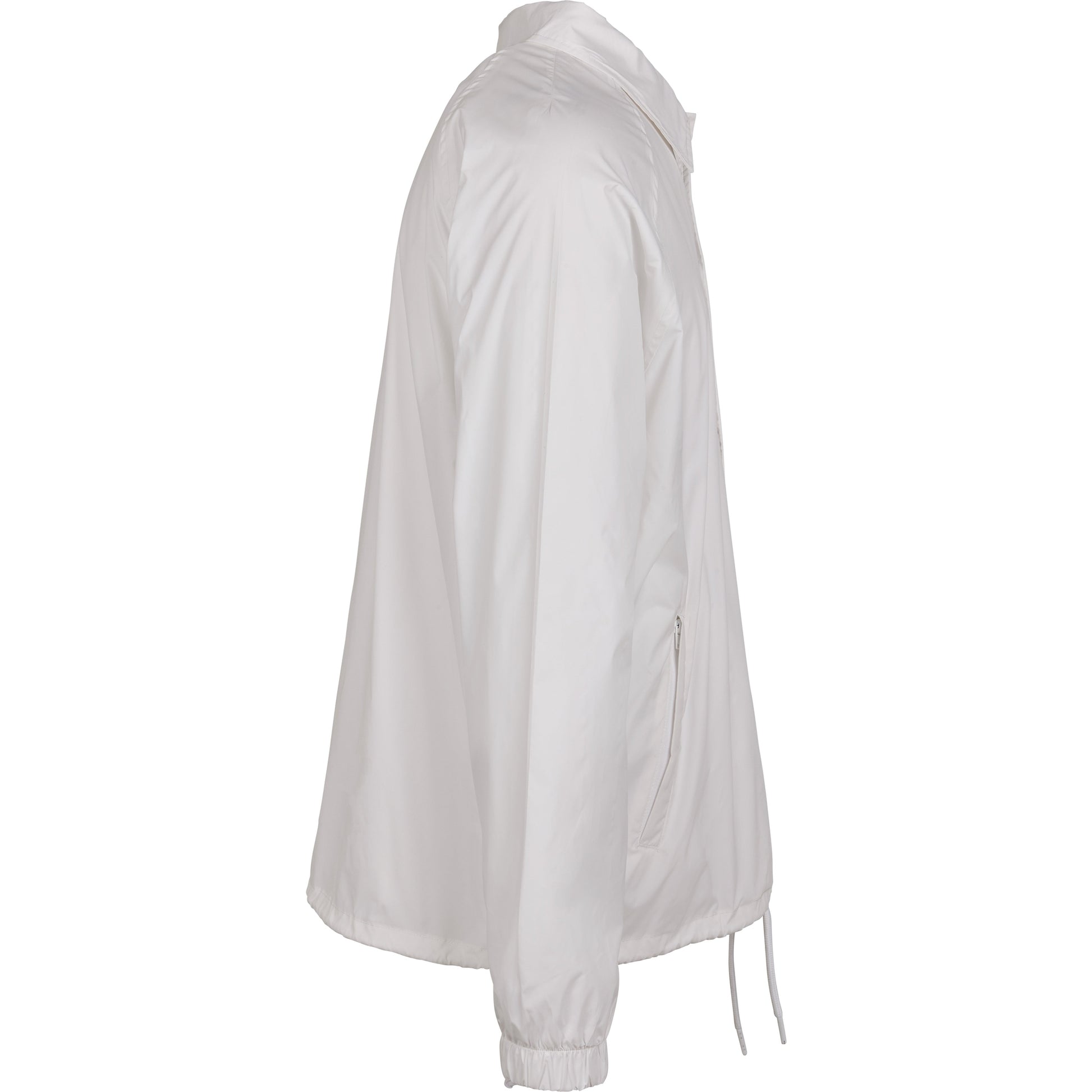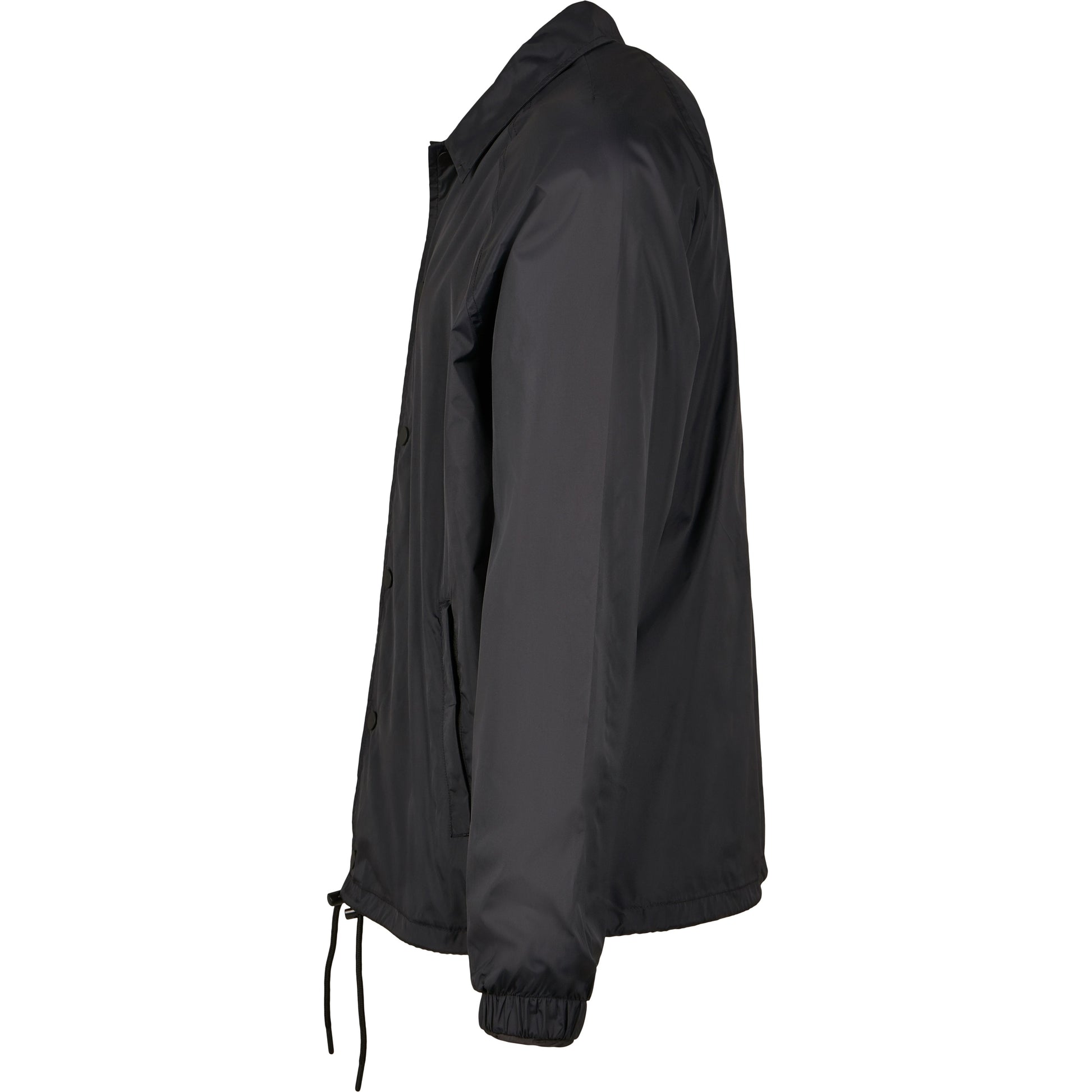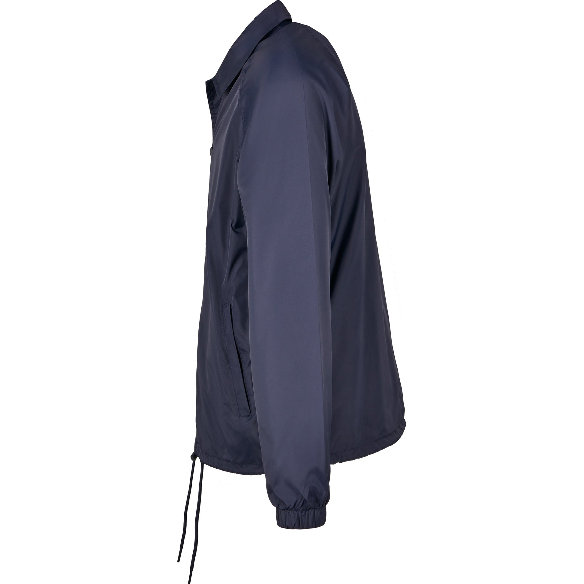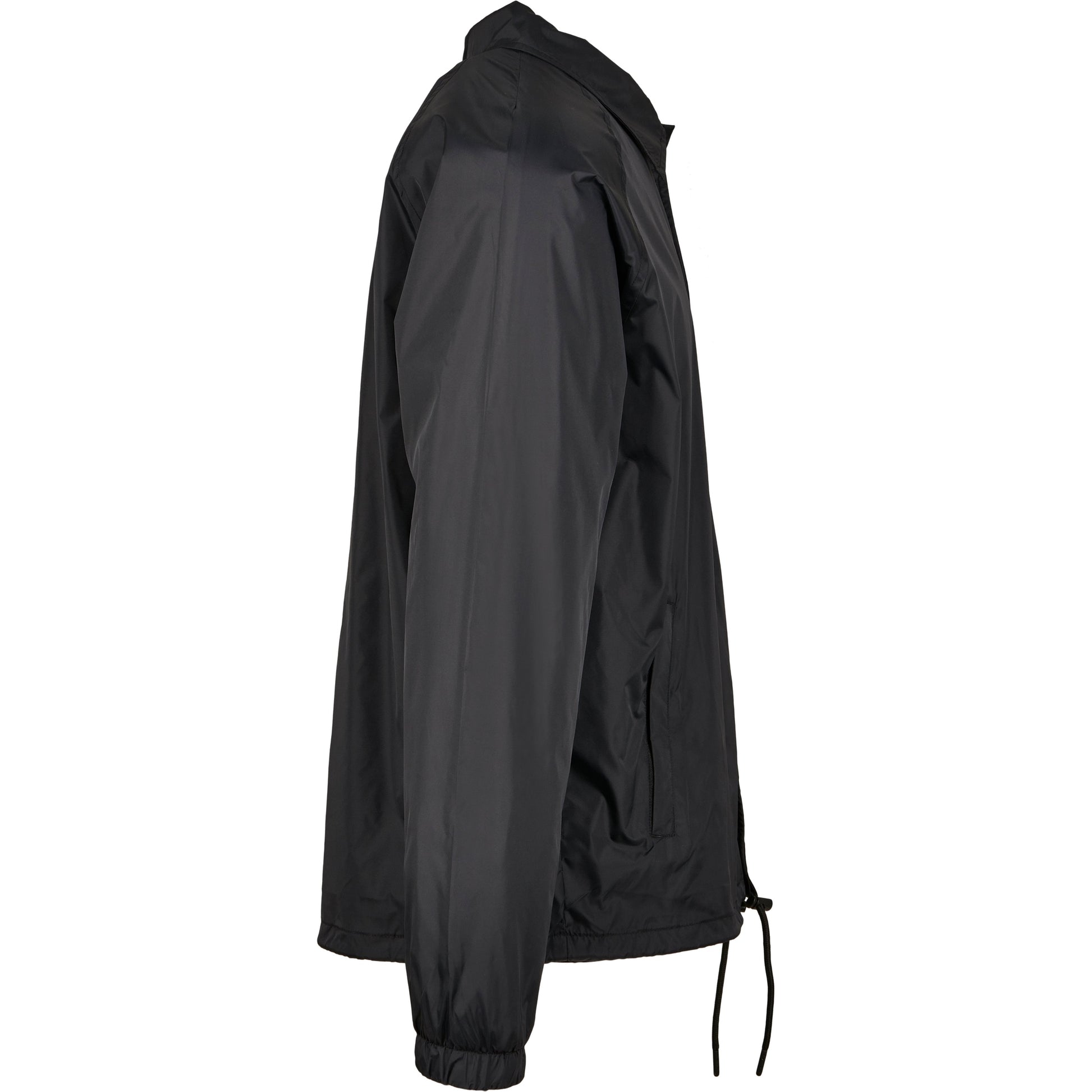 This sporty coach jacket pleases with a simple and functional design, which can be further enhanced through stitching, silk screening or flock printing. Its raglan cut with seamless shoulders in combination with the continuous press-button facing as well as the elastic cuffs turn this nice piece of garment into a real street wear style jacket. You will also get some handy side pockets and an elastic waistband with drawstring and stoppers at your disposal. The sophisticated design is rounded off by a simple yet elegant collar. The functional and robust upper is made of nylon, the lining out of cotton and taffeta.