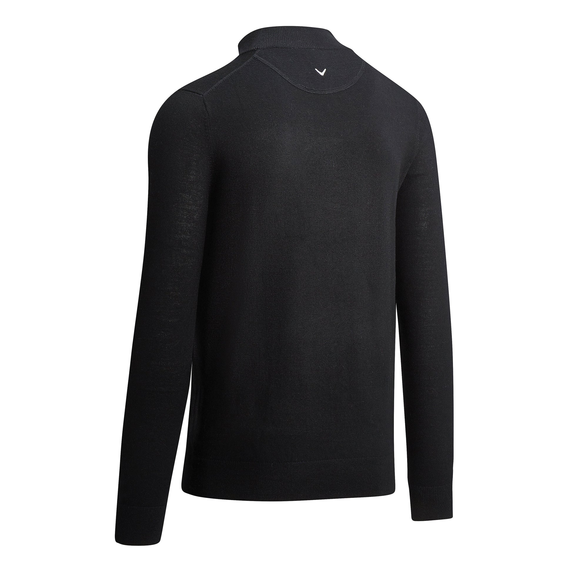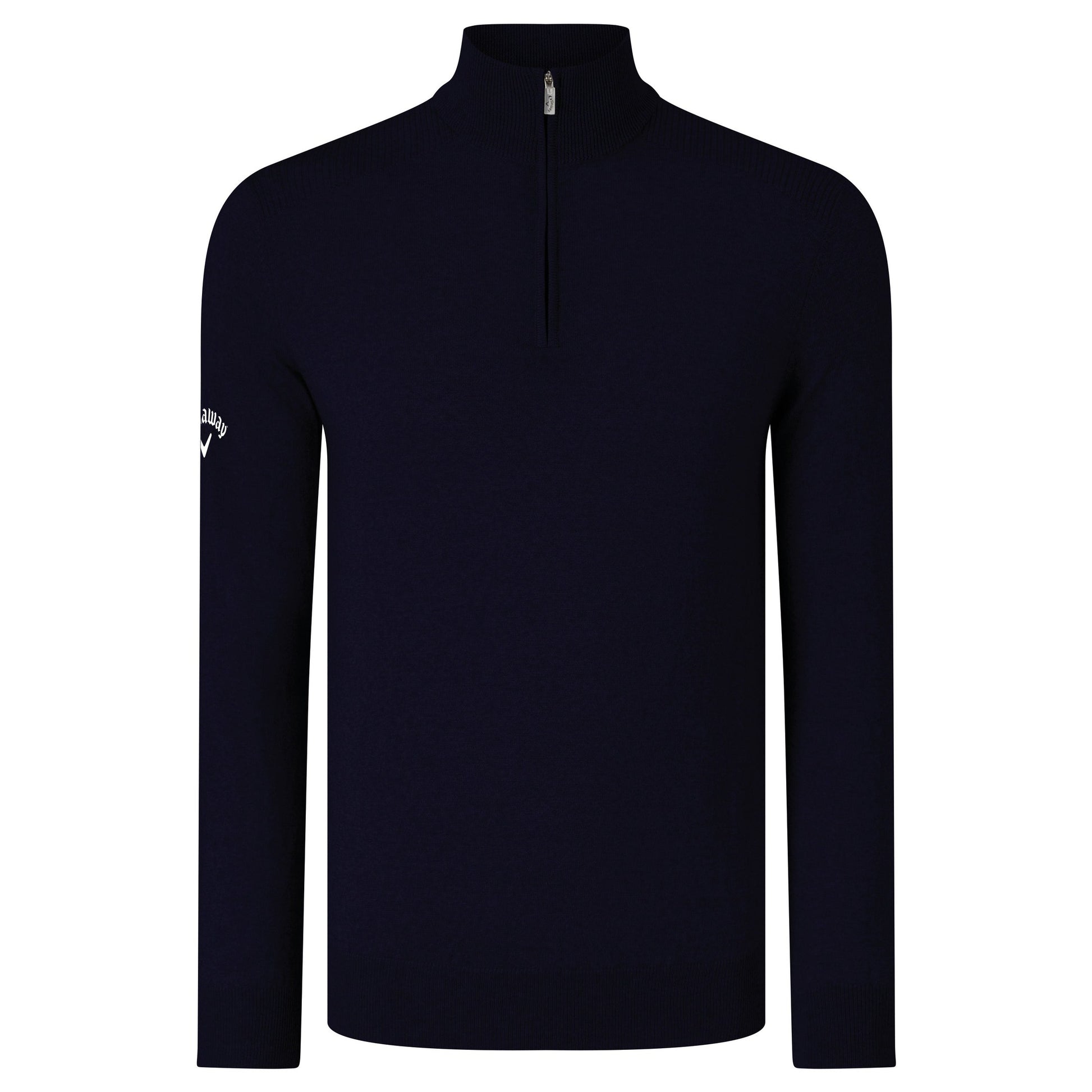 Ribbed shoulder ¼ contrast zip Merino sweater. Contrast or tonal embroidered Callaway Tour logo on the wearer's right sleeve and Chevron on the back neck. Oeko-Tex certified. Reach certified. WRAP certified.