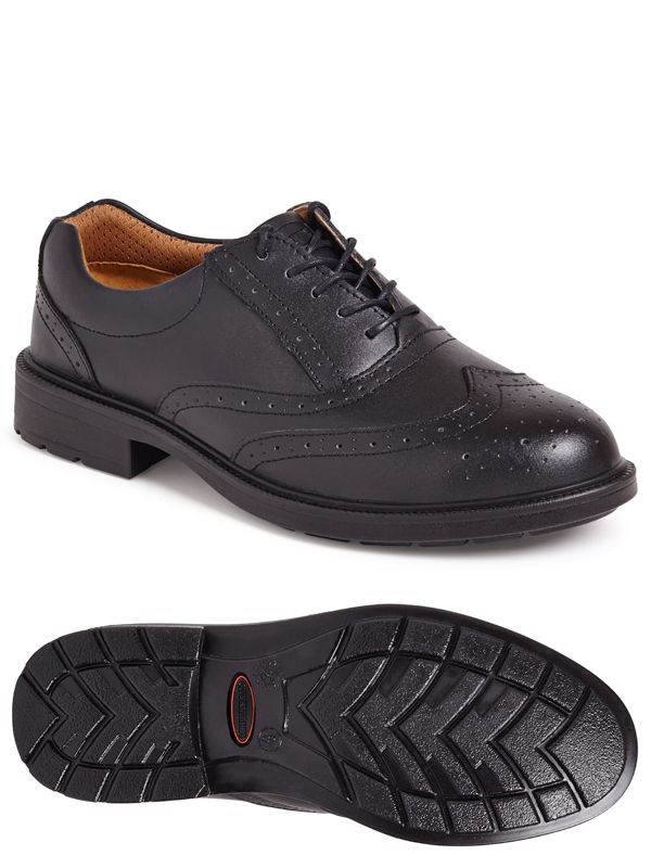 Black smooth leather safety shoe. Padded collar for added comfort. Steel toe cap and composite midsole protection. Moisture wicking inner lining. Dual density polyurethane outsole. Anti-static. A lightweight executive style uniform shoe for lighter duties.