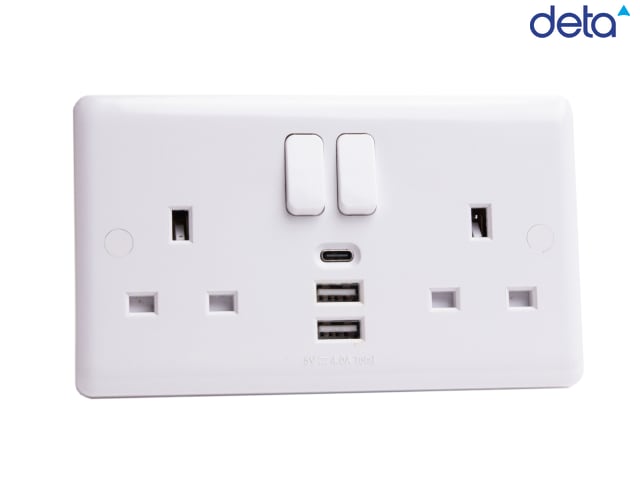 Deta Vimark 2-Gang Single Pole Switched Socket with 2 x Type A and 1 x Type C USB ports. This socket uses auto IC technology to detect connected devices and provide an optimised 4A (3A & 1A) simultaneous charging current. Ideal for kitchens, lounges, bedrooms and home offices.