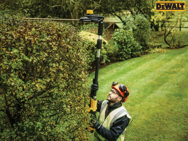 The DEWALT DCMPH566 XR Pole Hedge Trimmer has a lightweight, well balanced design for increased ergonomics and comfort. Fitted with a 7-position, 180? articulating head and a hardened steel, laser cut, dual action blade. Ideal for cutting hard to reach and thicker branches.