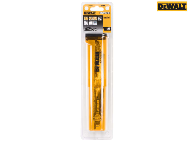 The DEWALT DT2440L 2X Life Reciprocating Saw Blade Set contains a mixture of blade types for a wide range of cutting jobs. Bi-Metal construction; combining an HCS body with HSS teeth. With optimised tooth geometry for fast effective cutting with increased cobalt content for longer cutting life. The ToughCoat heat resistant coating prevents heat build up to maximise blade life.