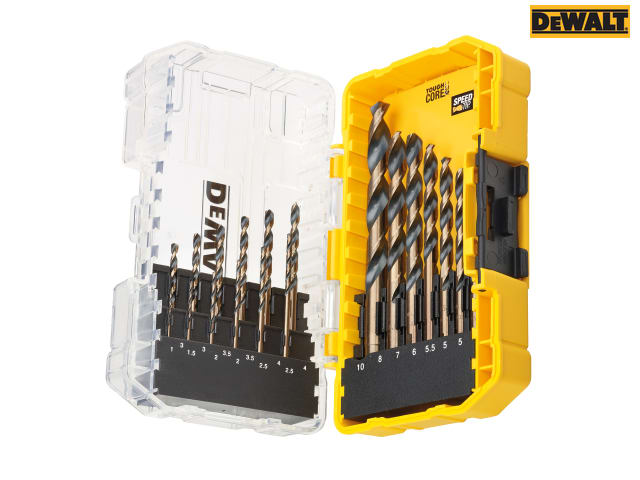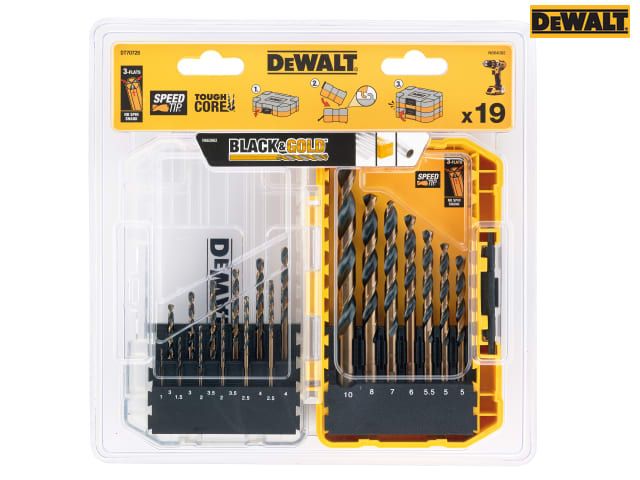 DEWALT Black & Gold HSS Drill Bits have a speed tip and a tough core for increased durability. The bits also incorporate a no-spin shank that eliminates the frustration of the bit spinning in the chuck. Supplied in a TOUGH CASE+, this is part of a connectable case system that is TSTAK compatible. Individual TOUGH CASES can be clipped together for easy transportation.